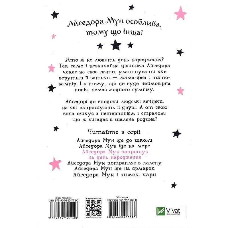 Книга «Айседора Мун запрошує на день народження» — це дитяче фентезі від письменниці Гаррієт Мункастер про унікальну дівчинку, яка наполовину фея, наполовину вампір. Скоро в героїні день народження і батьки запропонували малечі обрати, яку вечірку вона хоче — вампірську чи фейську. Однак тут на них чекав сюрприз: Айседора забажала… людське свято!