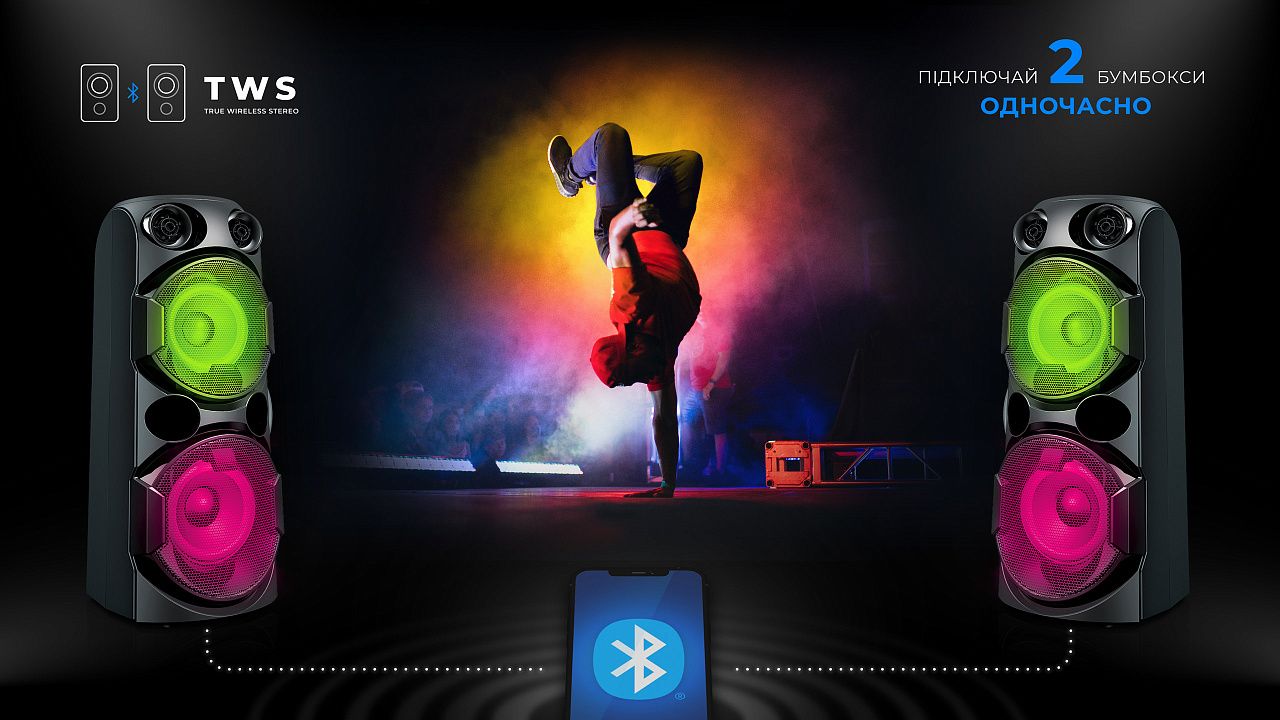 Підключай смартфон через Bluetooth, вставляй флешку або картку пам’яті, використовуй AUX – завжди маєш вибір, як слухати улюблену музику. А якщо хочеш ще більше звуку – активуй режим TWS, об’єднай дві колонки в одну бездротову 160 Вт стереосистему.
