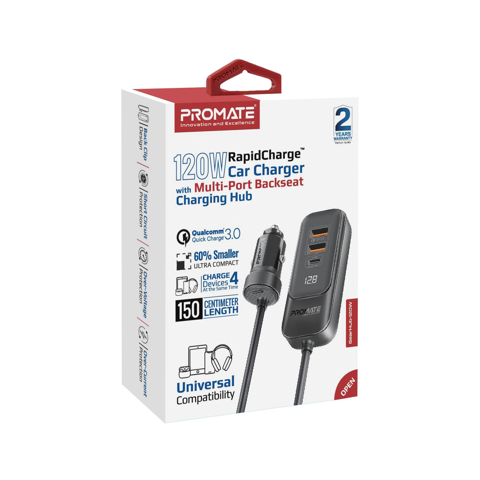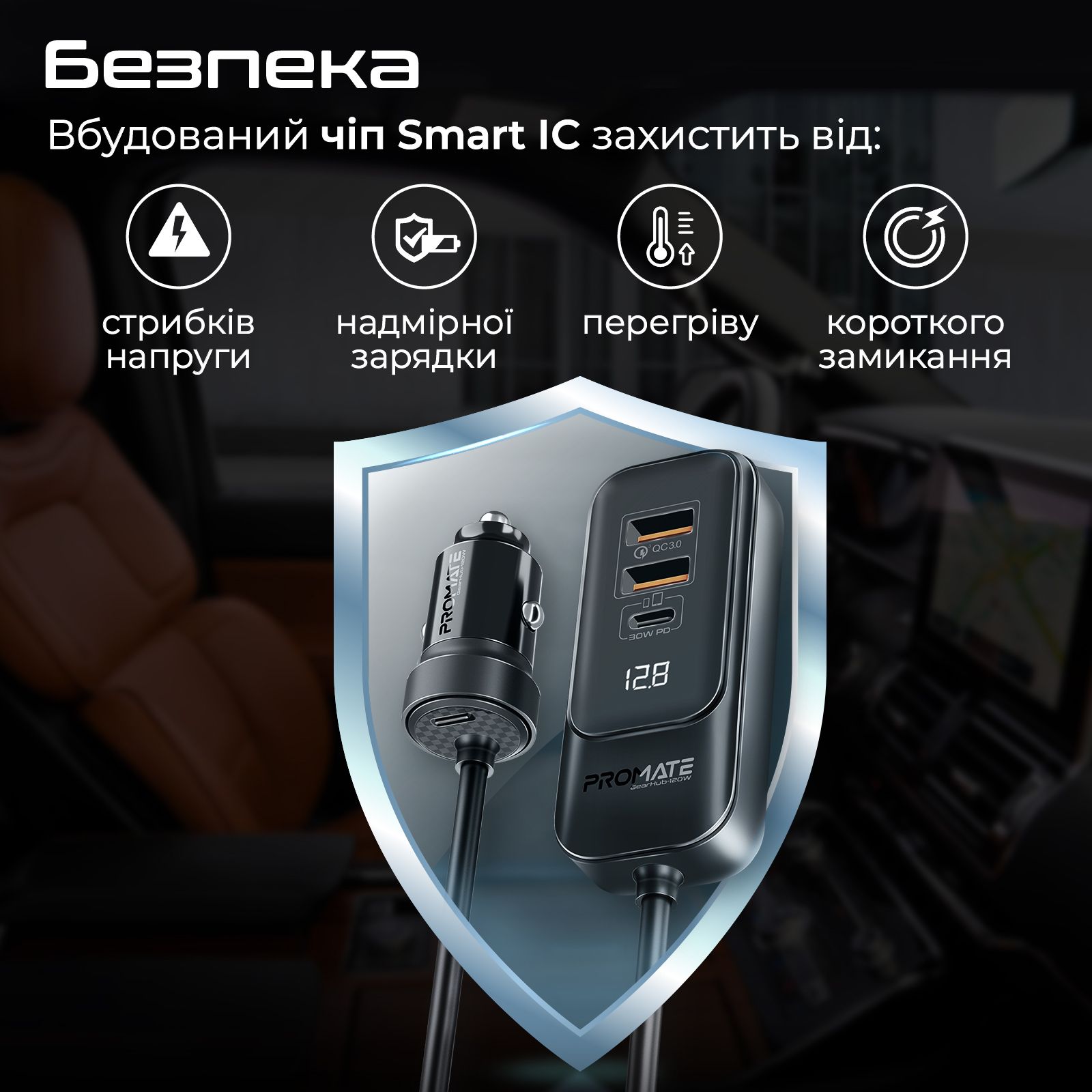 Вбудований чіп Smart IC захистить підключені девайси від перегріву, стрибків напруги, короткого замикання та надмірної зарядки. LED дисплей показує рівень напруги, з яким заряджаються пристрої.