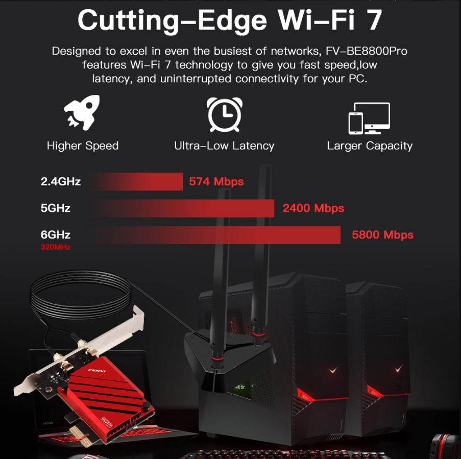 Насолоджуйтесь плавним онлайн-геймінгом з Fenvi WiFi 7 PCIe адаптером, який забезпечує швидкість до 1200 Мбіт/с та підтримку частот 2.4G та 5G.