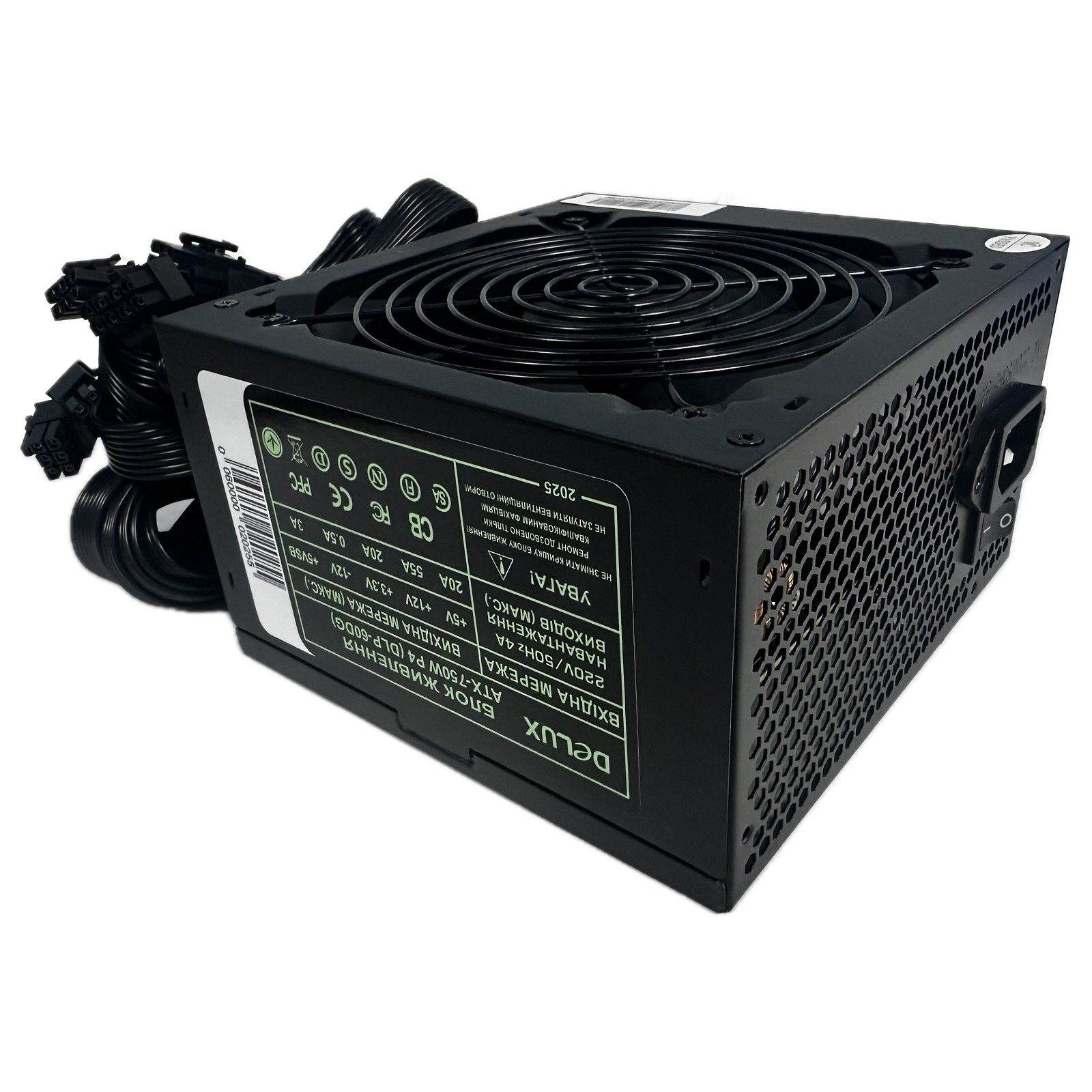 Модель Delux 750W (DLP60DG) зробить ваш персональний комп’ютер по-справжньому надійним та довговічним. Цей блок живлення чудово справляється з функціями вторинного джерела живлення для інтегрованих та дискретних графічних адаптерів, а також інших пристроїв, встановлених у ПК. Завдяки активній системі PFC пристрій не перегрівається під час автоматичного компенсування потужності. У конструкції передбачені роз’єми під лінії резервного підживлення відеоадаптерів. Також є достатня кількість входів для процесора та материнської плати, Peripheral, SATA. Експлуатаційний ресурс є вельми значним. Завдяки роботі вбудованого лопатевого кулера та вентиляційної перфорації забезпечується підтримання температури під корпусом на рівні, необхідному для коректної роботи внутрішніх вузлів блоку живлення.