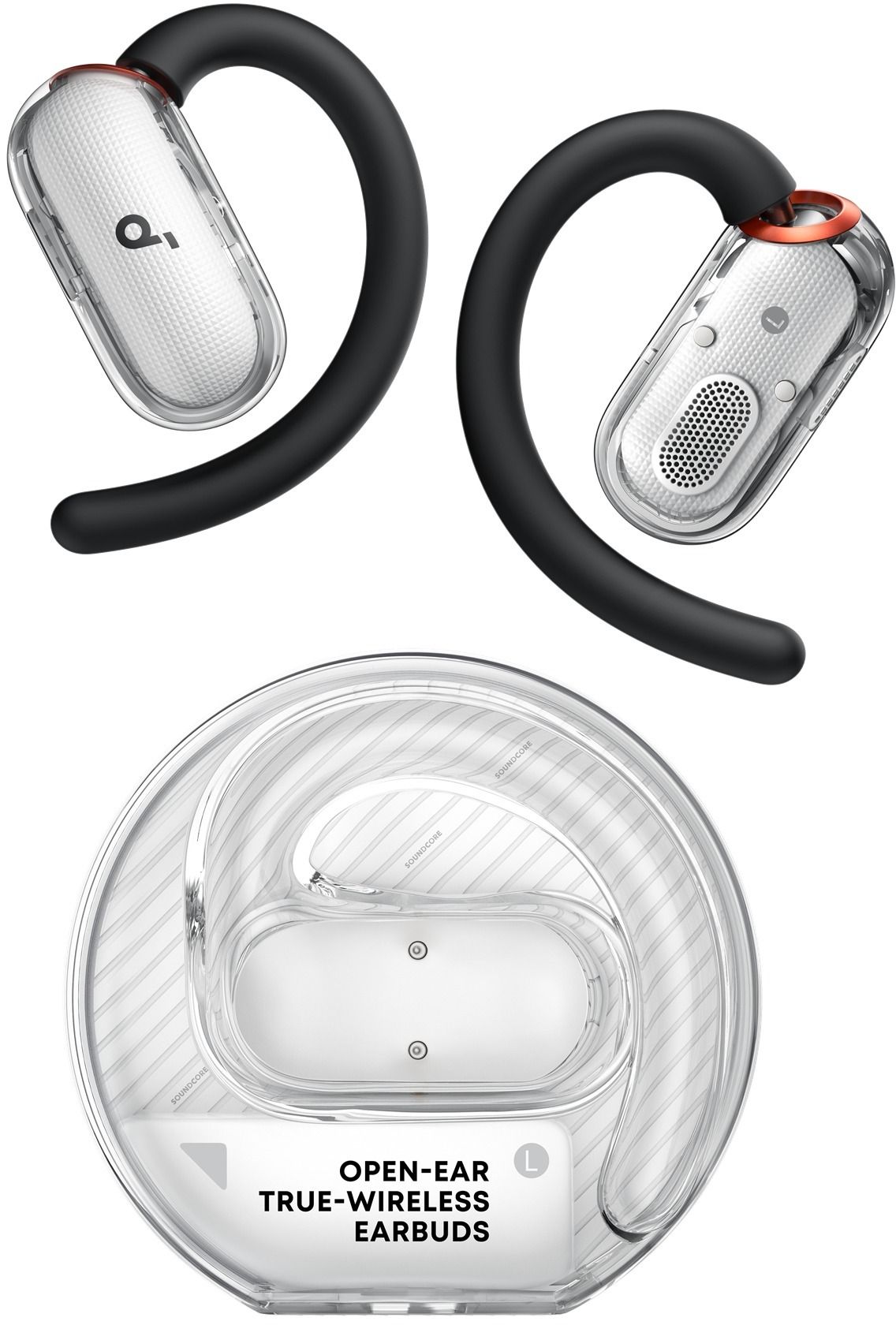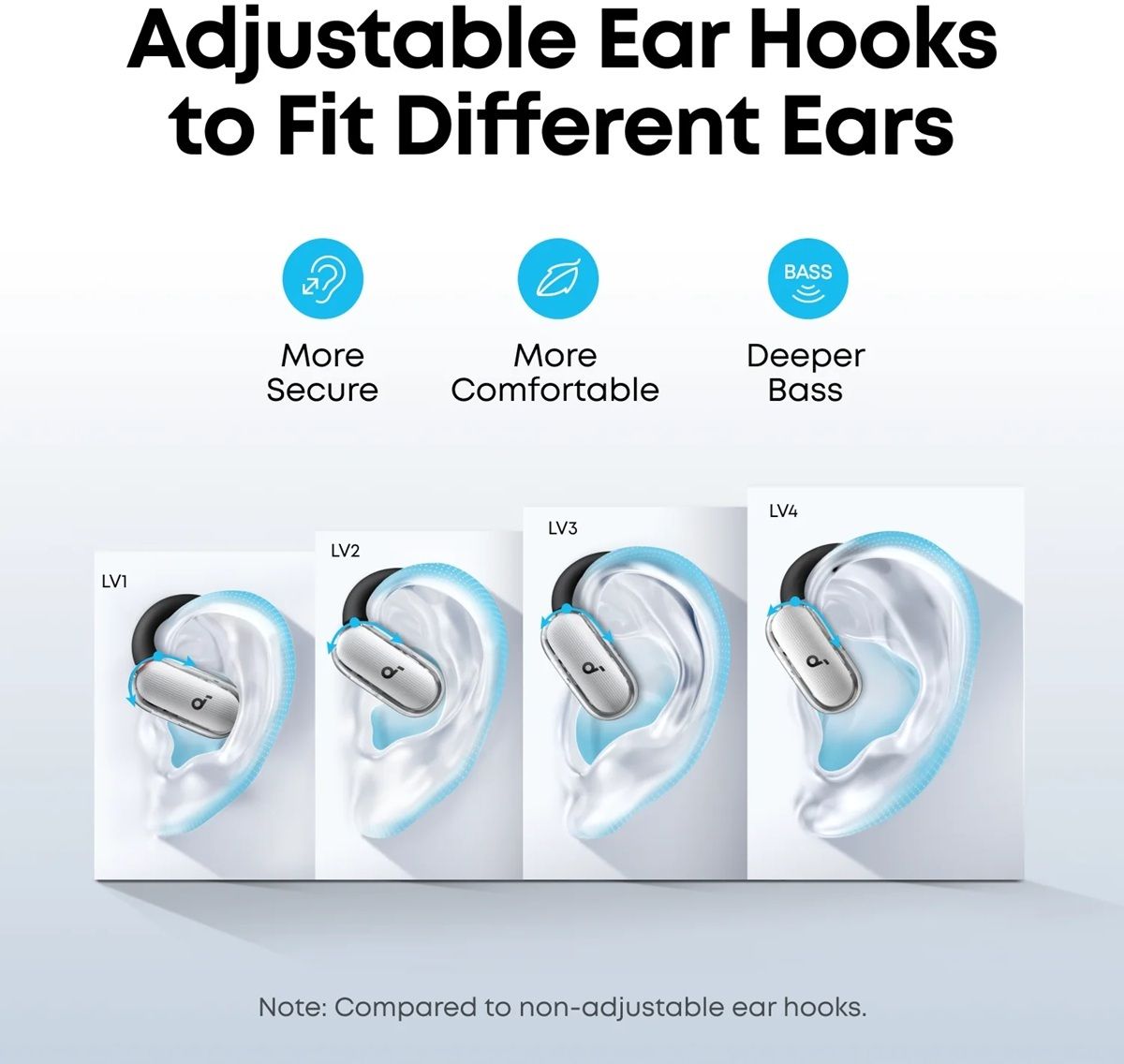 Гарнітура вирізняється інноваційним відкритим дизайном, який не закриває вушний канал, забезпечуючи комфорт без тиску та дозволяючи чути навколишні звуки. Завдяки 4-рівневим регульованим вушним гачкам, SoundCore V40i адаптується до будь-якої форми вуха, забезпечуючи надійну фіксацію навіть під час інтенсивних рухів. Ця конструкція не лише підвищує комфорт, але й наближає динаміки до вушного каналу, забезпечуючи глибший бас із приростом до 7.5 дБ порівняно з нерегульованими гачками, що робить звук насиченим і потужним.