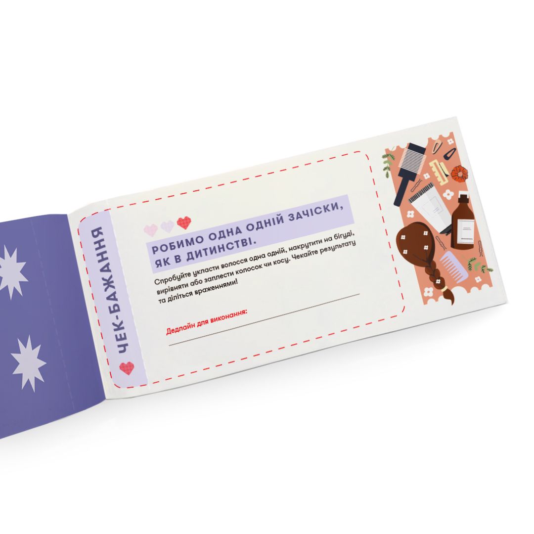 Купуйте чекову книжку бажань «Для мами», даруйте найріднішій та виконуйте разом завдання, які ще дооовго згадуватимете.