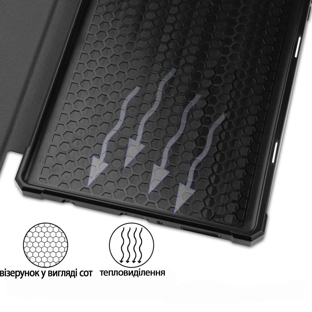 Особливістю даного чохла є багатофункціональна конструкція: обкладинка легко трансформується у зручну підставку для комфортного перегляду відео, роботи з текстом чи здійснення відеодзвінків. Задня поверхня має посилене потовщення і спеціальний захист кутів, що значно підвищує стійкість до ударів та падінь.