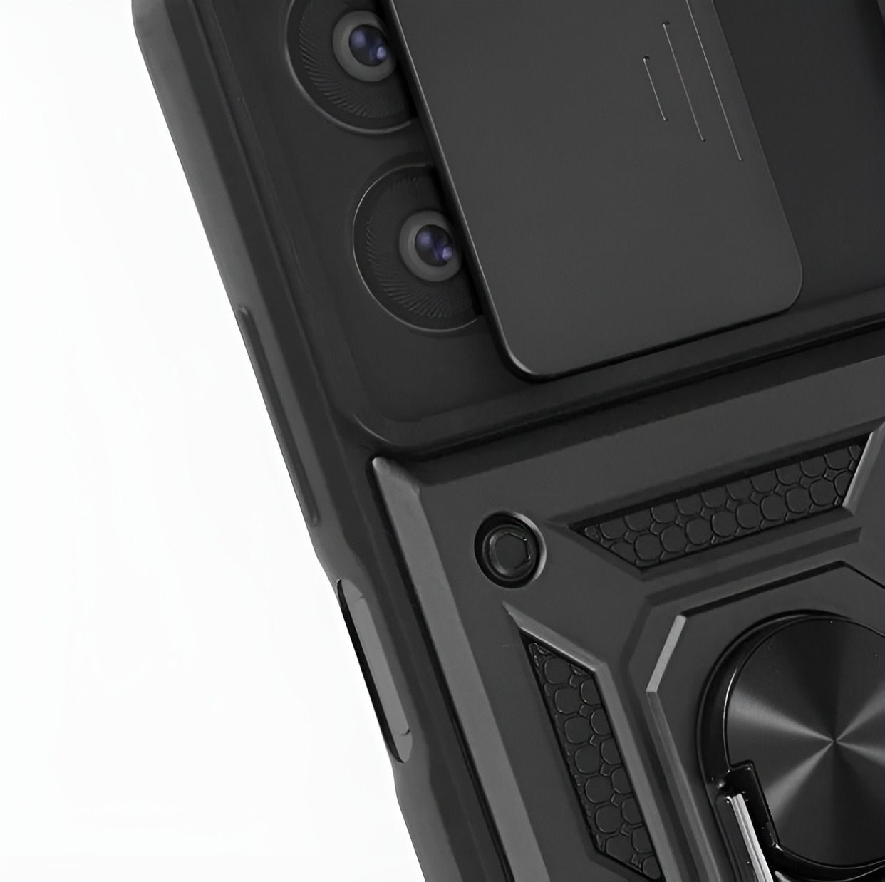Гнучка силіконова панель має жорсткий металізований корпус та кільце-підставку для пальця. Чохол здатний витримати навіть сильні удари та подряпини.