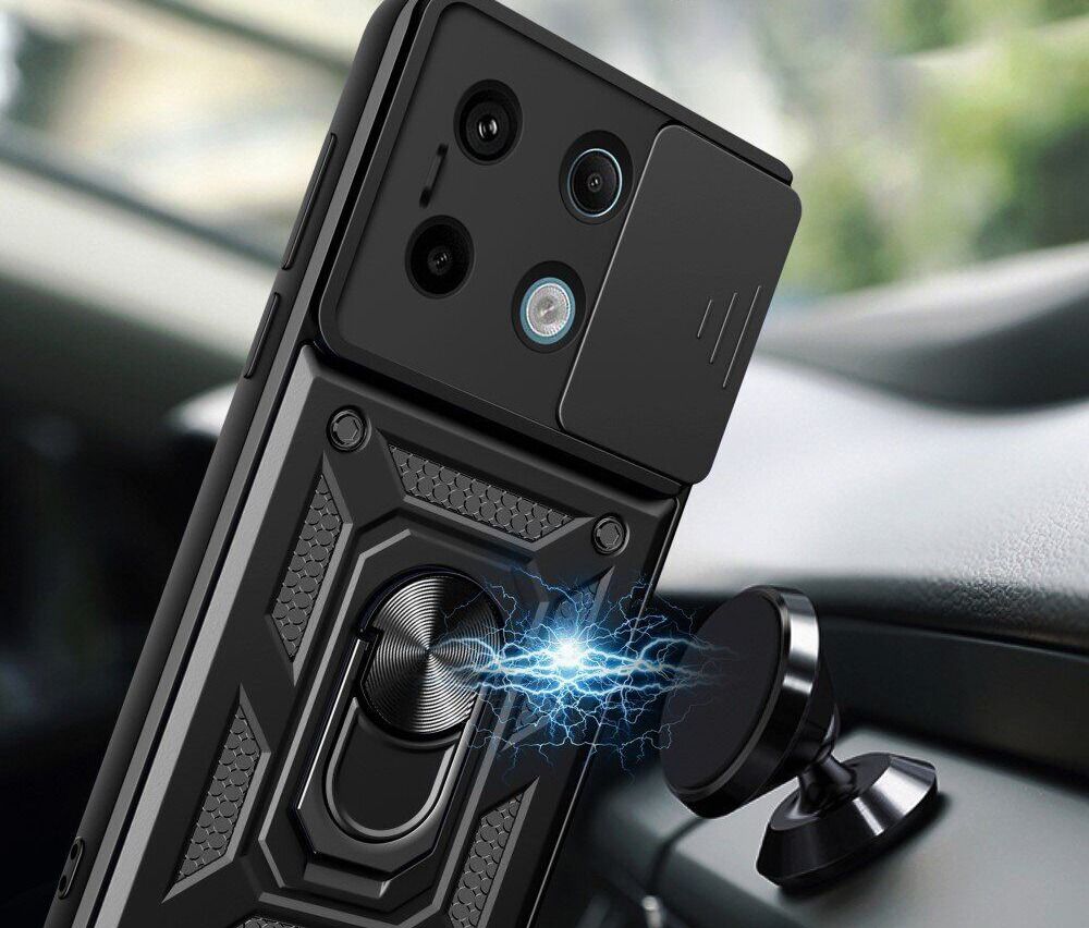 Гнучка силіконова панель має жорсткий металізований корпус та кільце-підставку для пальця. Чохол здатний витримати навіть сильні удари та подряпини.