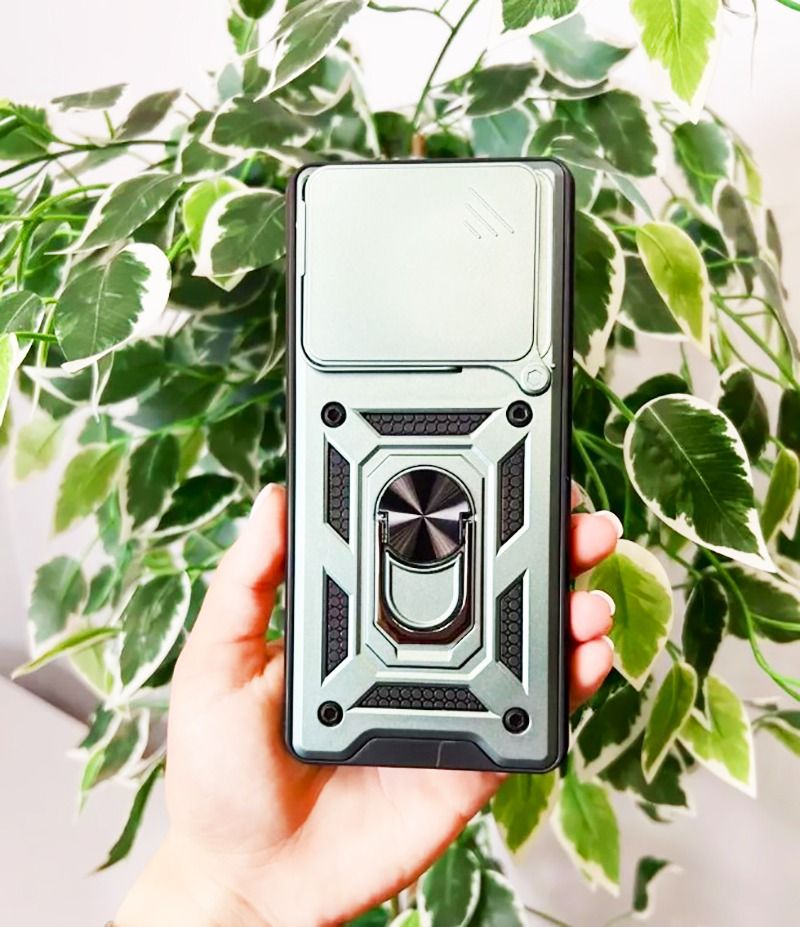 Гнучка силіконова панель має жорсткий металізований корпус та кільце-підставку для пальця. Чохол здатний витримати навіть сильні удари та подряпини.