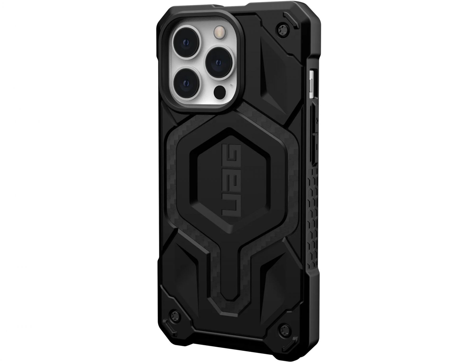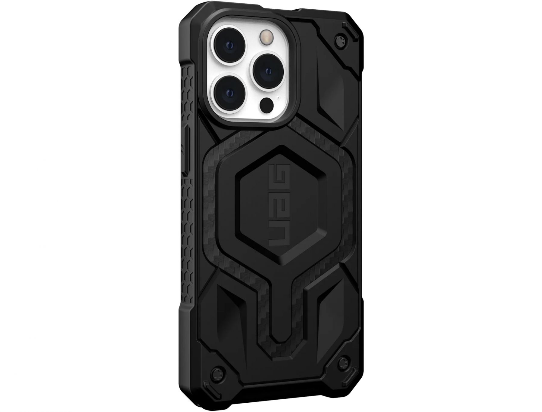 Чохол Monarch Pro MagSafe від UAG – це безкомпромісний захист від механічних загроз, включаючи не тільки подряпини та невеликі удари, але й серйозні падіння на підлогу. В його конструкції лежить багатошарове компонування, що включає: ударостійку серцевину, каркас з поліуретановим покриттям, захисну полікарбонатну пластину, металеву фурнітуру, а також еластичні силіконові елементи. Все це забезпечує максимальні амортизаційні якості, про що свідчить відповідність стандарту MIL STD 810G 516.6. Рифлена поверхня спинки та "стільникові" насічки на ребрах додатково покращують хват у руці. У конструкції враховано розташування камери та функціональних роз’ємів, для яких передбачені спеціальні вирізи, що не знижують зручності використання. Клавіші прикриваються м’якими, чутливими до натискання дублікаторами. Окремо слід відзначити наявність спеціальних магнітів, впаяних у спинку, які забезпечують підтримку технології MagSafe. З цим чохлом ви не відчуєте жодних проблем із підключенням до сумісних бездротових ЗУ.