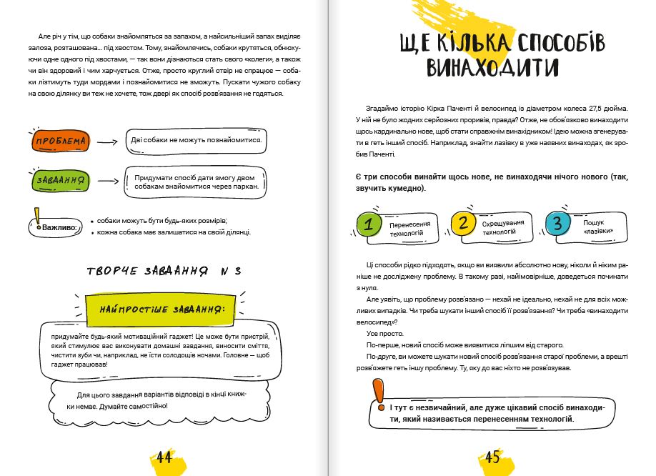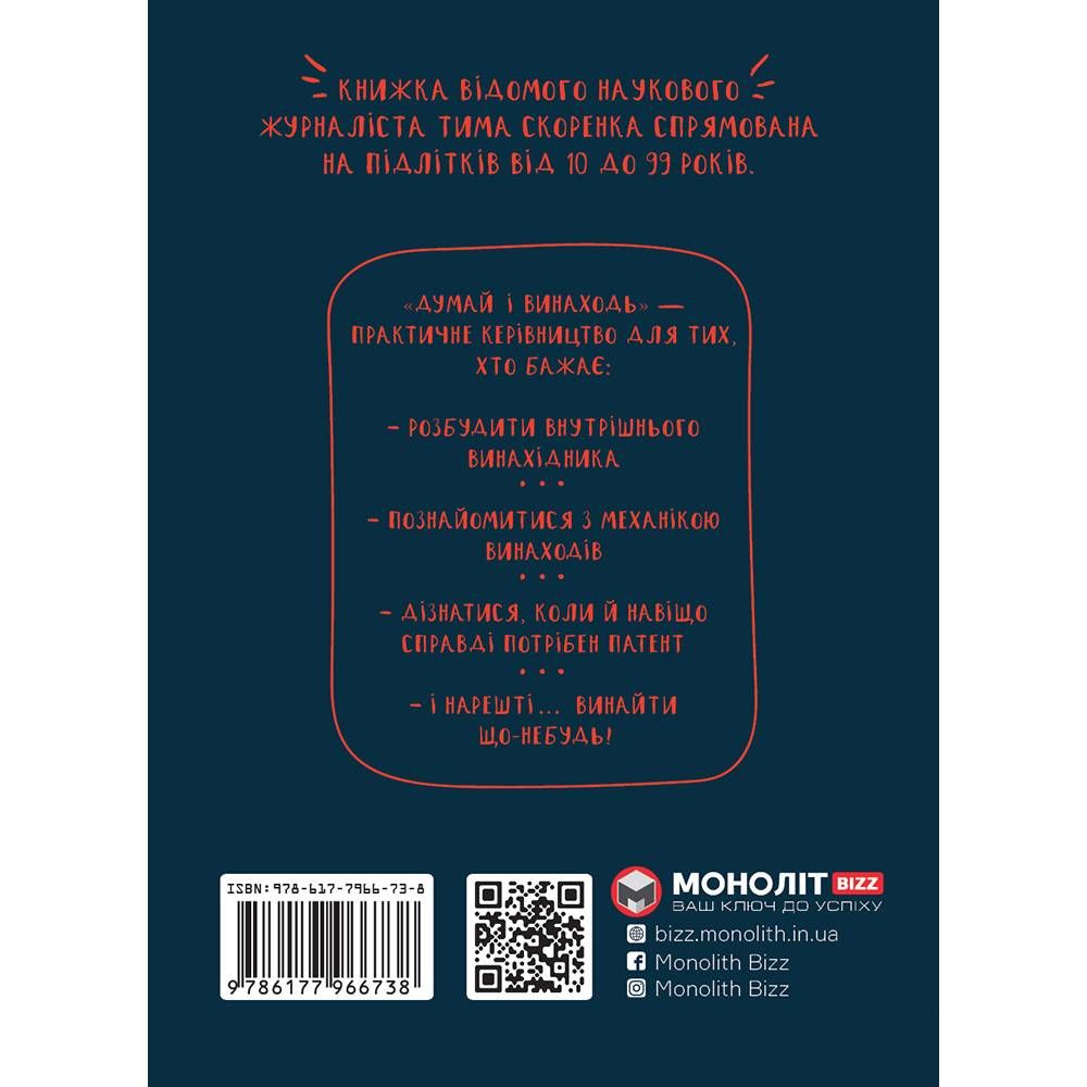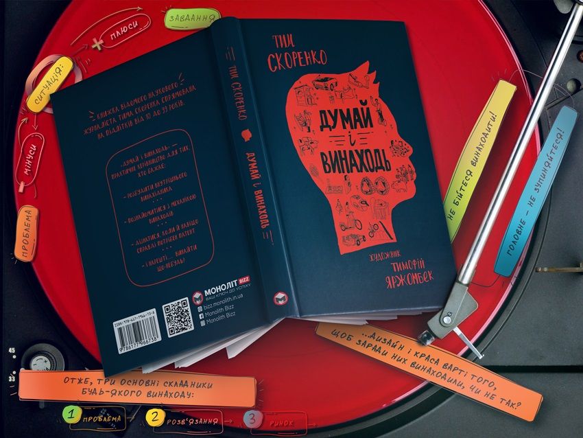 Книжка «Думай і винаходь» Тима Скоренка пропонує незвичайні експерименти для пробудження внутрішнього винахідника кожного з нас. Також ваша дитина дізнається з неї безліч цікавих реальних історій, що підштовхнуть до геніальних думок.