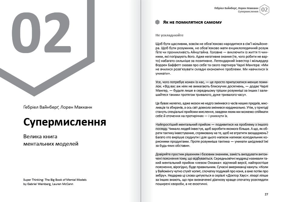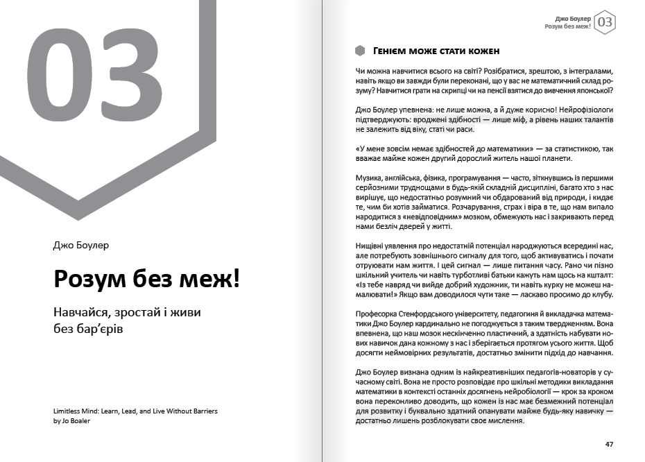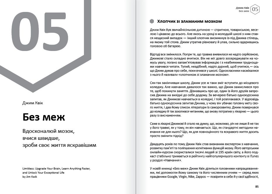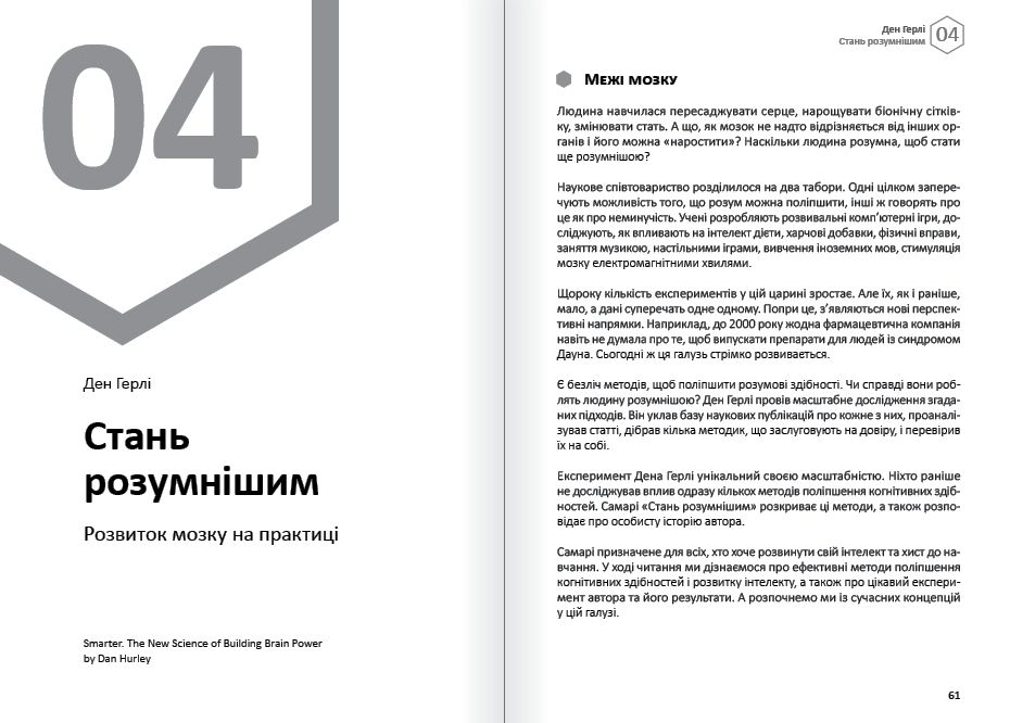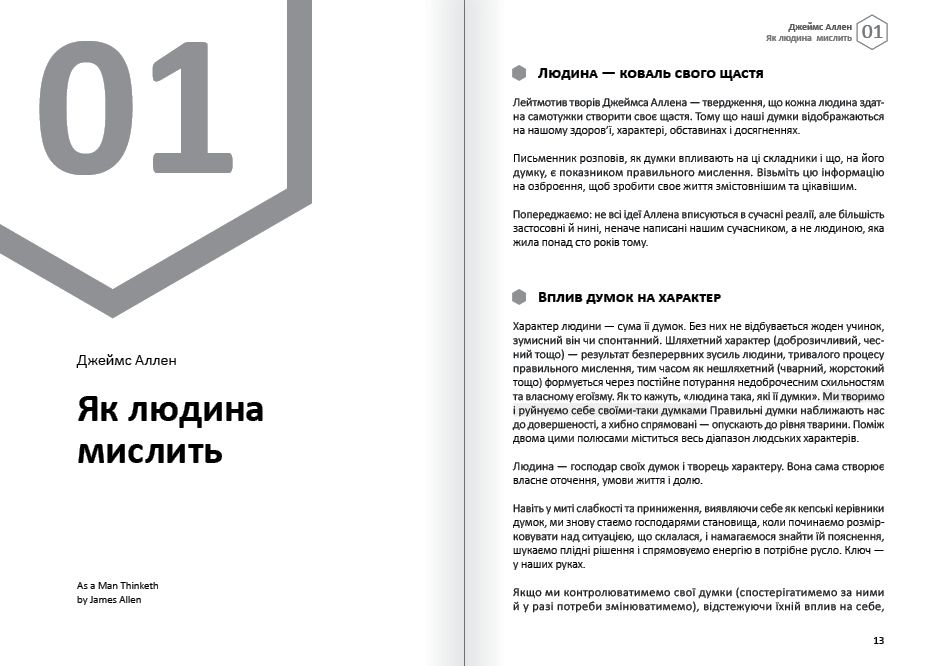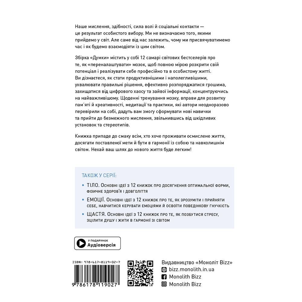 Тільки наше мислення може привести нас до успіху — або стати перепоною на шляху до нього. За допомогою самарі дванадцяти світових бестселерів, що ввійшли до цієї збірки, ви зможете досягти емоційного благополуччя, особистого і професійного успіху через управління власними думками, навчитеся мислити нестандартно, придумувати видатні ідеї з нуля і знаходити неординарні рішення будь-якої задачі.
