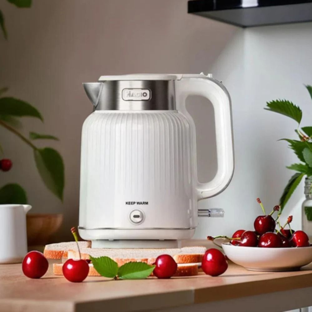Електрочайник Magio MG-508 - це чудовий електричний чайник з корпусом з високоякісного пластику білого кольору. З потужністю 2000 Вт він швидко закип’ятить воду, при тому, що вміщує дана модель цілих 1,7 літрів, чого цілком достатньо для сім’ї. Індикатор рівня води дозволяє контролювати кількість води в чайнику. Для зручності він повертається на підставці на 360 градусів. Технічними перевагами електрочайника Magio є наявність фільтру від накипу, візуальний індикатор рівня рідини в приладі і опція автоматичного відключення після закипання. Чайник легко очищається за допомогою вологої губки або серветки.