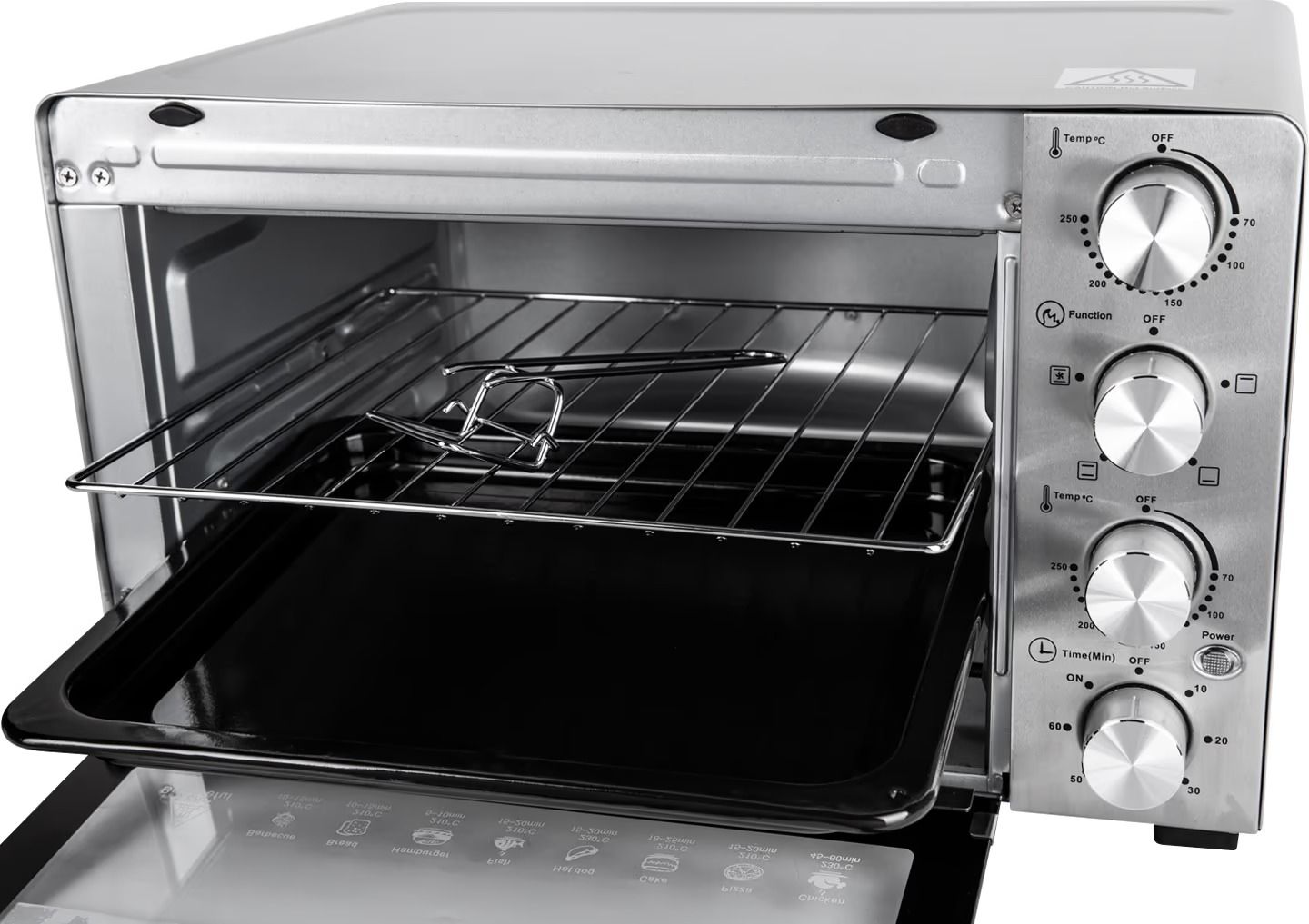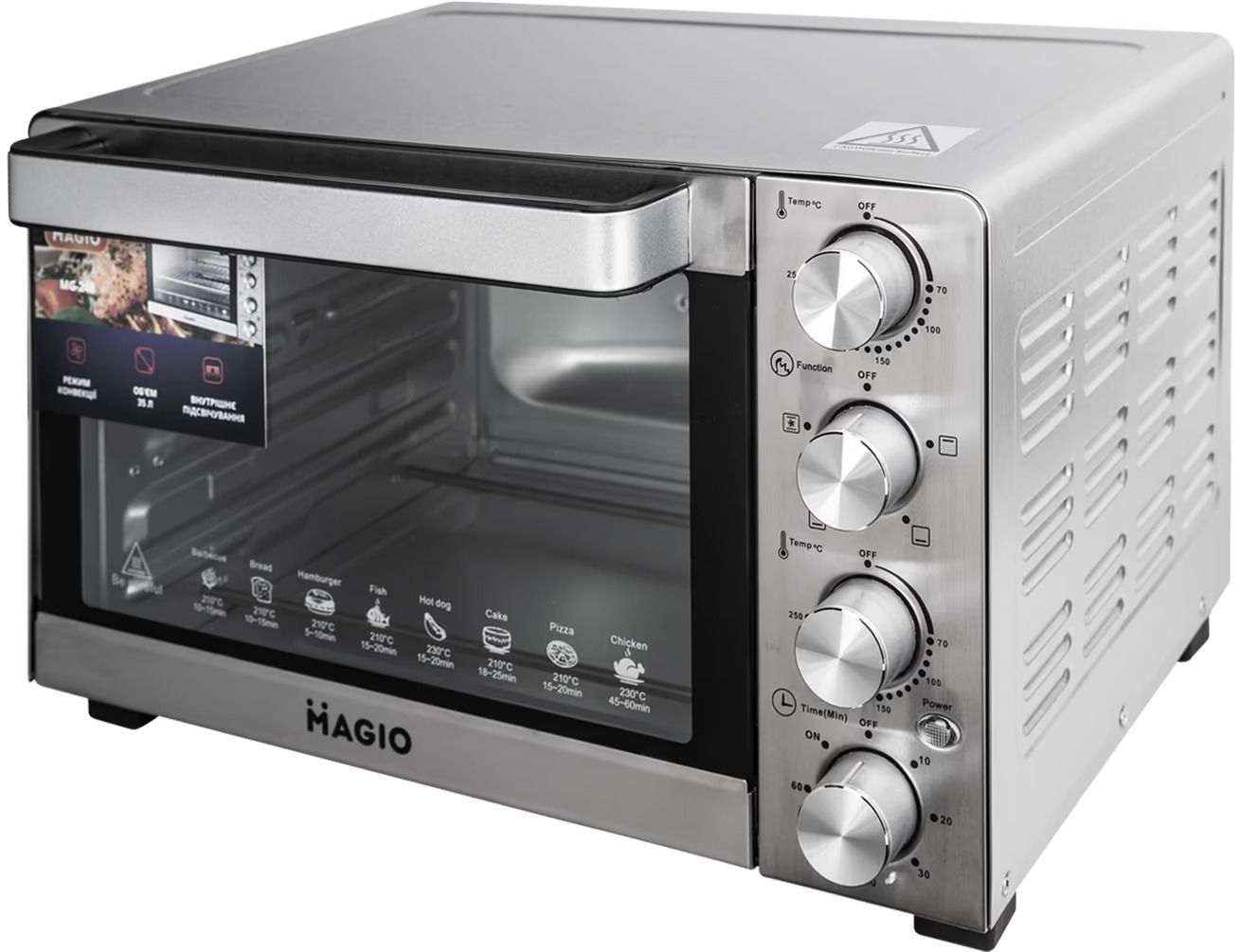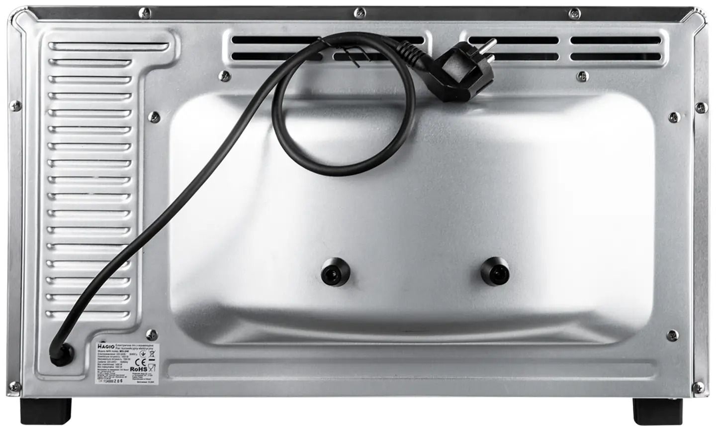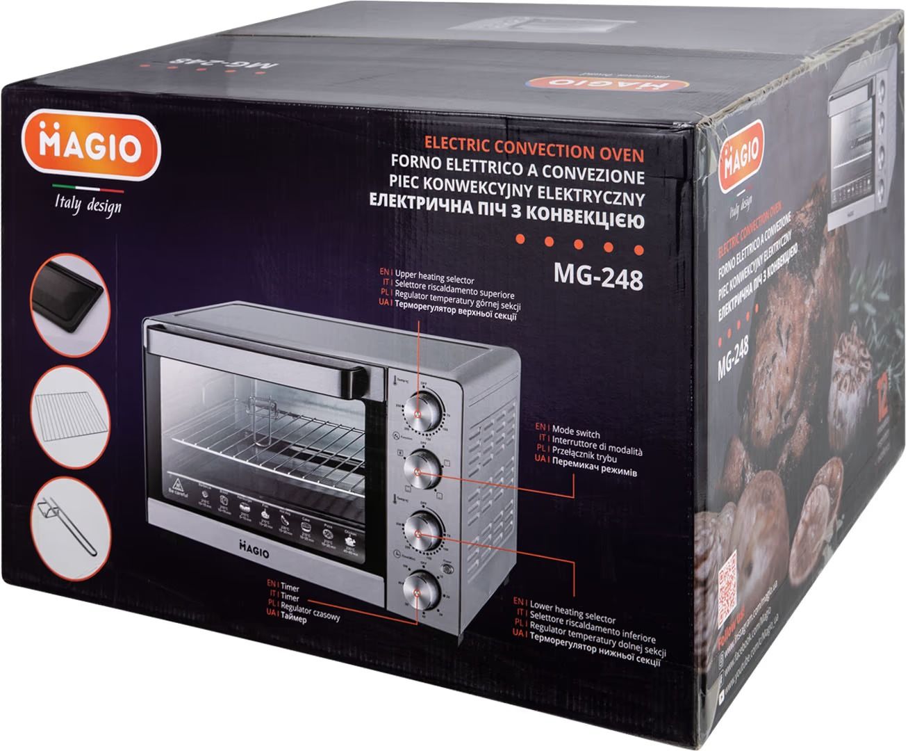 Компактна електропіч MG-248 потужністю 1500 Вт забезпечує оптимальний результат приготування. Внутрішній об’єм складає 35 літрів, чого цілком вистачить, якщо ви плануєте готувати страви для своєї родини. 6 автоматичних режимів дозволяють готувати безліч найрізноманітніших страв. Прилад оснащений регулятором температури 70-250°С і таймером на 60 хвилин. Режим конвекції рівномірно розподіляє тепло всередині приладу, піч працює як конвекційна духовка. У комплекті є все необхідне для готування: піддон, знімна решітка, знімна ручка.