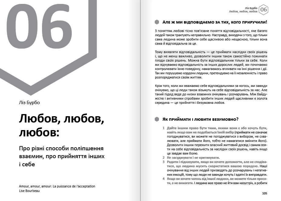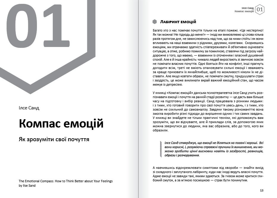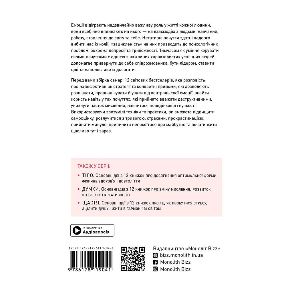 Ця книжка —збірка саммарі 12 світових бестселерів про емоції і емоційну гнучкість, яка допоможе давати лад неприємним почуттями і виходити з конфліктних ситуацій, жити в гармонії з власними емоціями і оточенням, знаходити підхід до рідних і колег, але головне — мати такий підхід до самого себе.