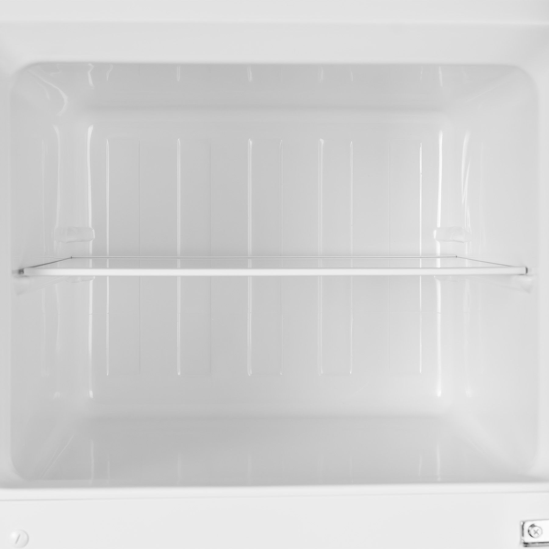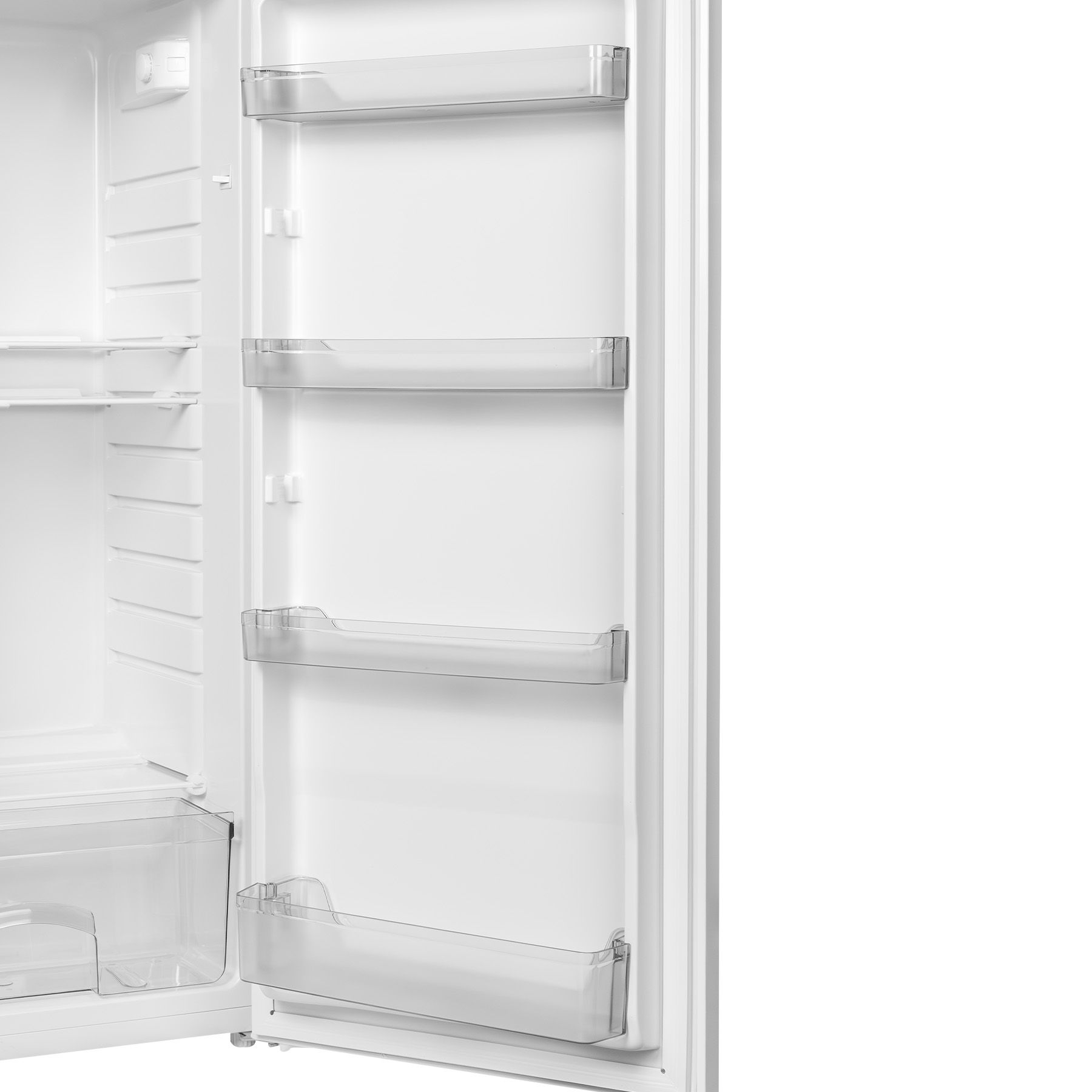 У холодильному відсіку на 199 л контролювати свіжість продуктів можна за допомогою LED-освітлення, що розташоване збоку. Лампа накрита напівпрозорим плафоном. Є три скляні полиці з пластиковою окантовкою, що витримують до 25 кг навантаження. Профіль передніх полиць - прозорий, задніх - білий. Чотири пластикові шухляди розташовані внизу для зберігання більших продуктів. Кріспер бокс скляний, щоб зберігати свіжість овочів або фруктів, зелені. Докупити можна підставку під яйця і пляшки з рідинами, масницю. Ящики в морозилці на 50 л відсутні, їх повноцінно замінює одна решітка, створюючи два відділи для заморозки. Додатково можна купити підставку для заморозки льоду.