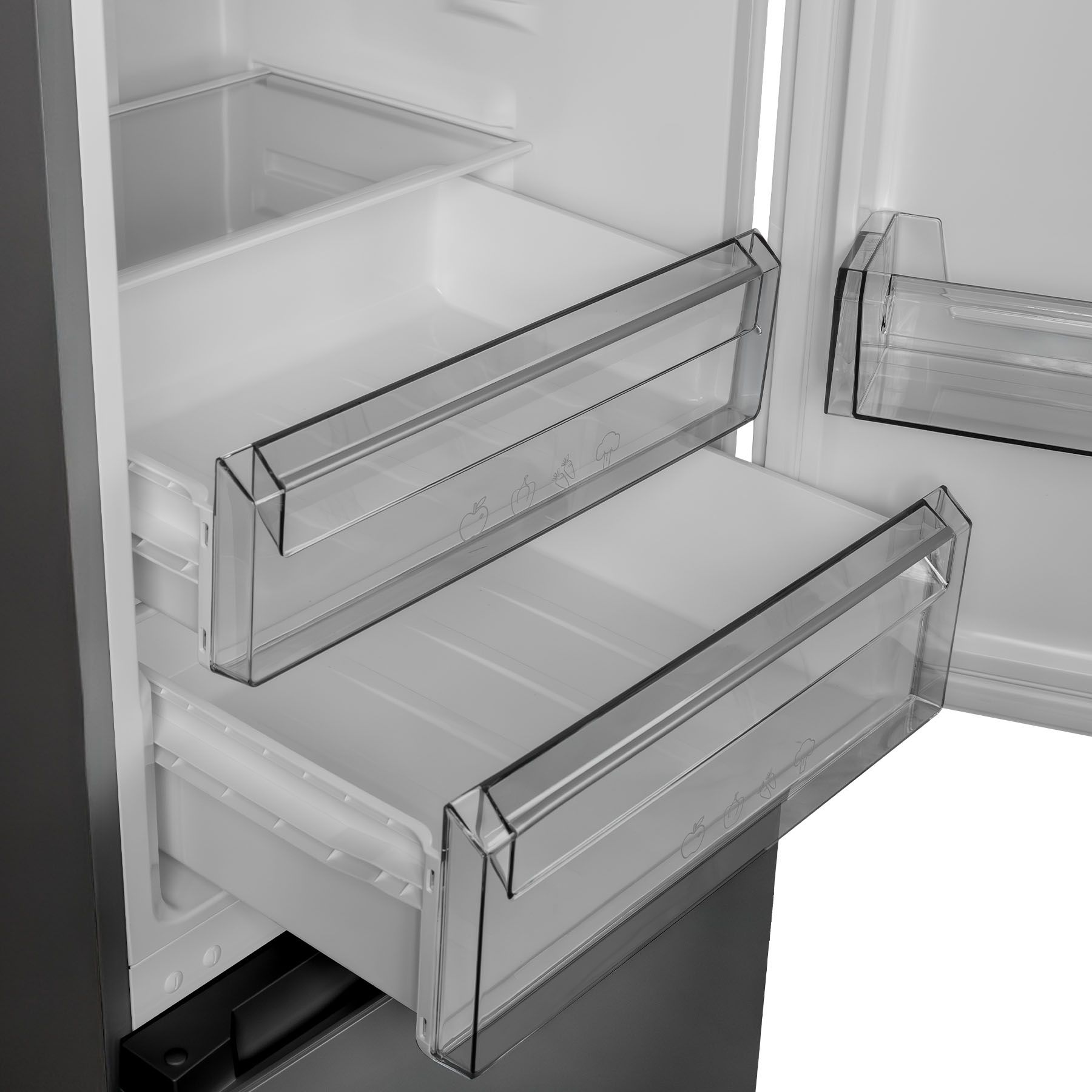 Графітна модель NFND-200X поділена на два відділення — холодильник та морозильна камера. Дверцята мають потаємні ручки, що не виступають за межі корпусу. Зверху на фронтальній частині розміщений сенсорний регулятор режимів роботи та індикатор температур. Ніжки з резиновими насадками не дряпають підлогу та можуть регулюватися за висотою, для максимально стабільного встановлення пристрою. Загальні габарити моделі — 595x635x2010 мм.