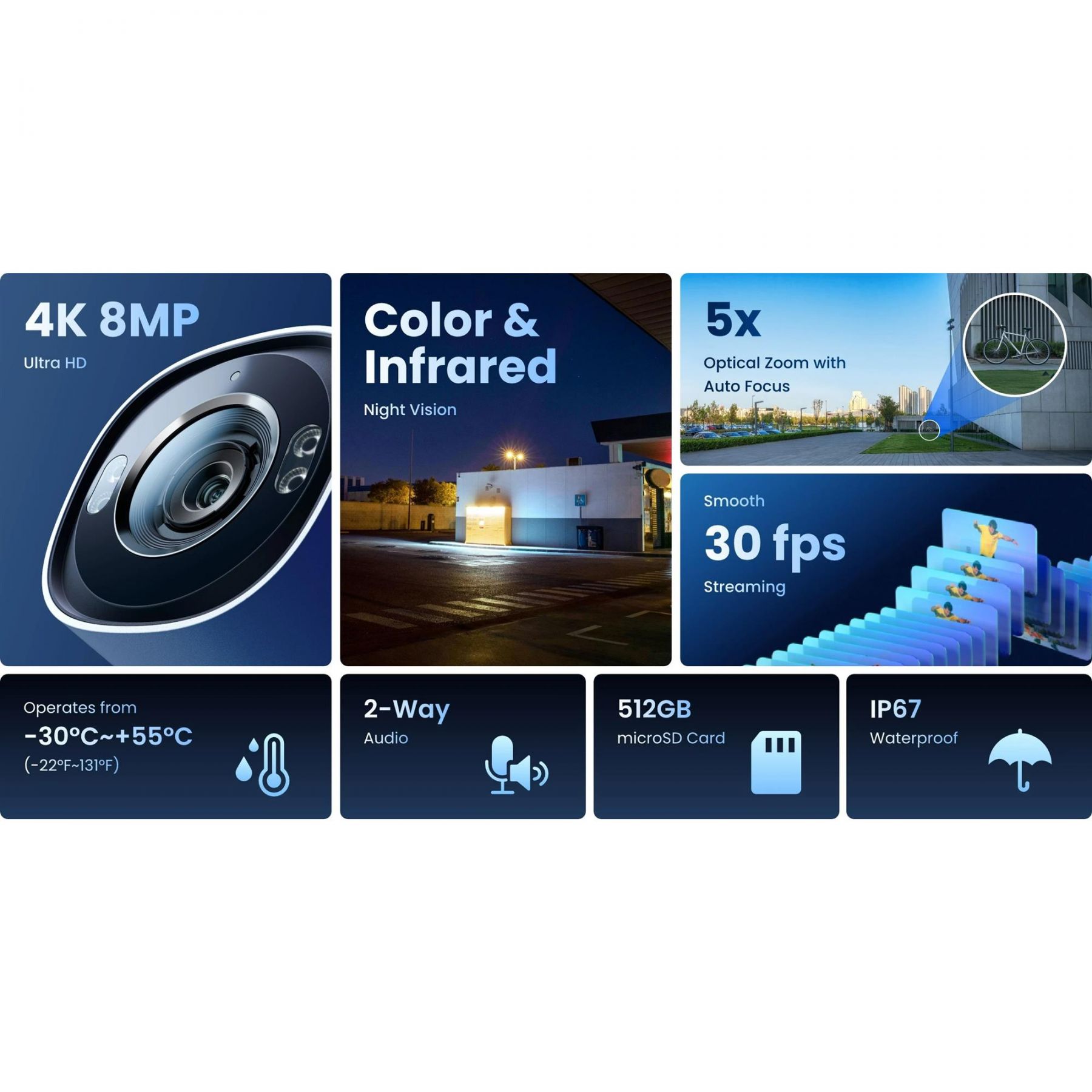 Підтримує карту microSD об’ємом до 512 ГБ, розширене локальне зберігання відео високої роздільної здатності без використання зовнішніх пристроїв. Ця велика ємність дозволяє довше записувати та легко відтворювати, забезпечуючи надійне збереження відео для підвищеної безпеки.