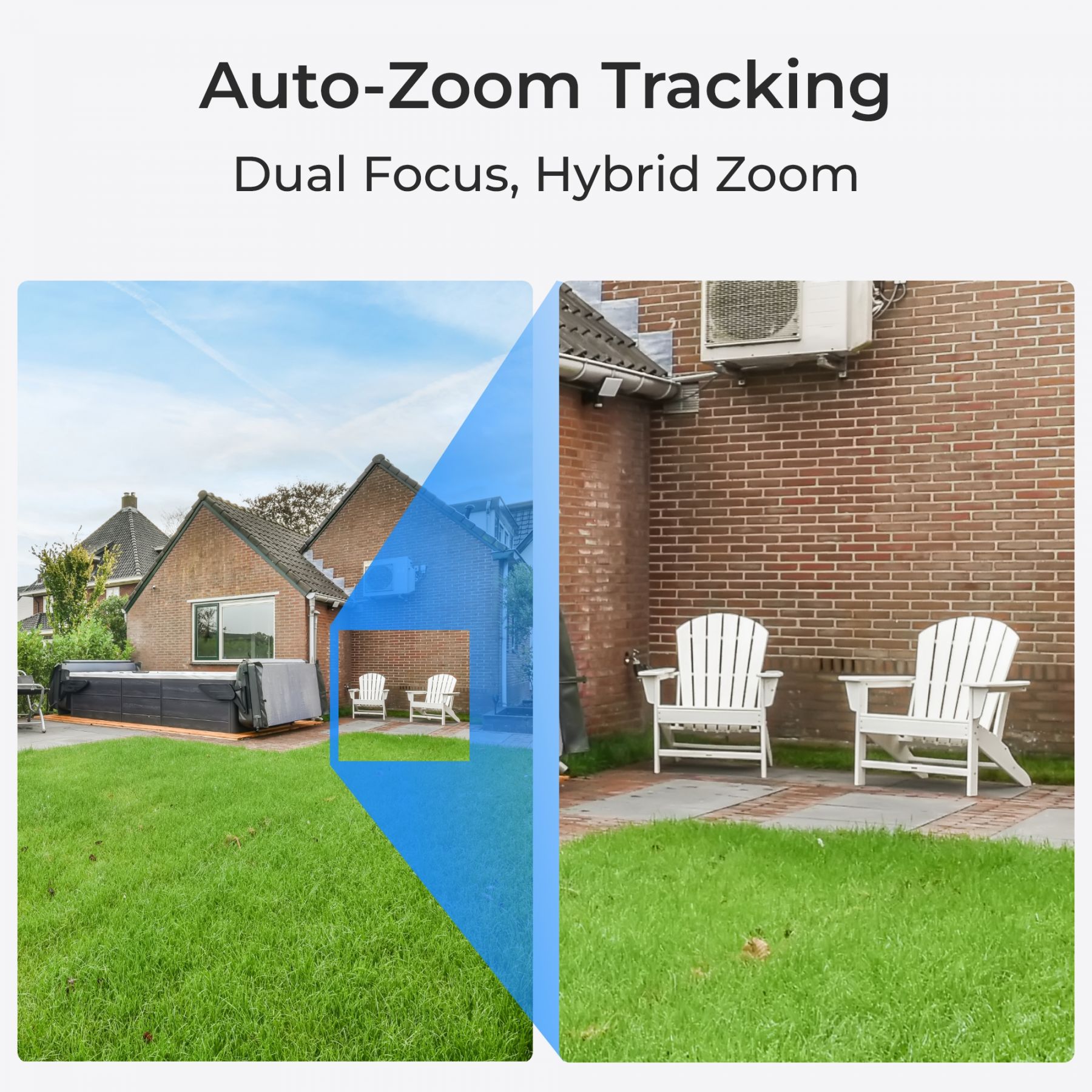 Двооб’єктивна камера може панорамувати та нахиляти (до 355° по горизонталі, 90° по вертикалі) для автоматичного відстеження об’єкта та відображення його як у панорамному, так і у збільшеному вигляді.