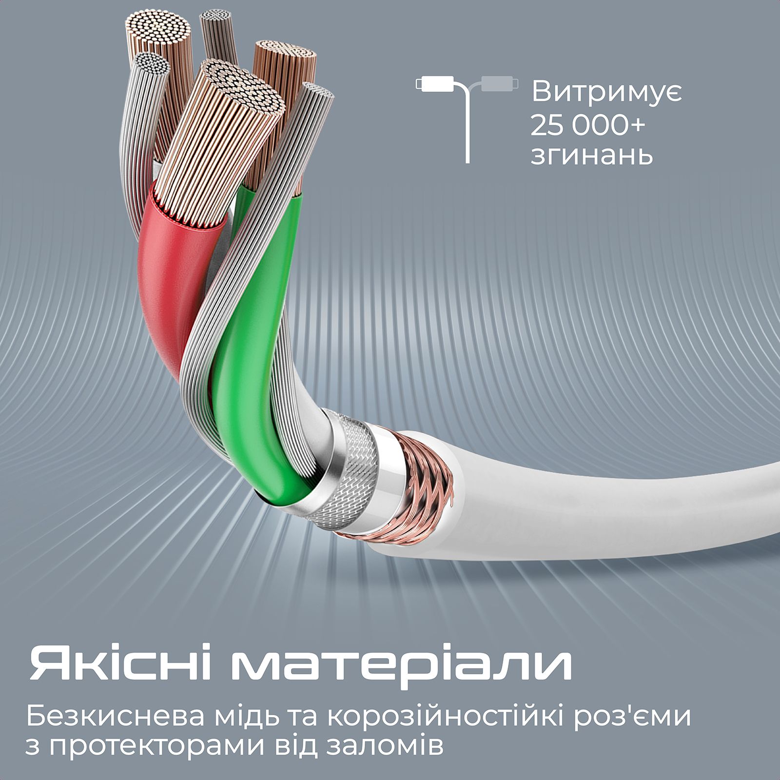 Кабель із безкисневої міді, екранований спеціальною фольгою. Корозійностійкі роз’єми та протектори від заломів витримують понад 25000 підключень/згинань. Силіконова оболонка: найкращий, на сьогоднішній день, матеріал при виробництві кабелів - еластичний, зносостійкий, міцний на розрив і одночасно приємний на дотик.