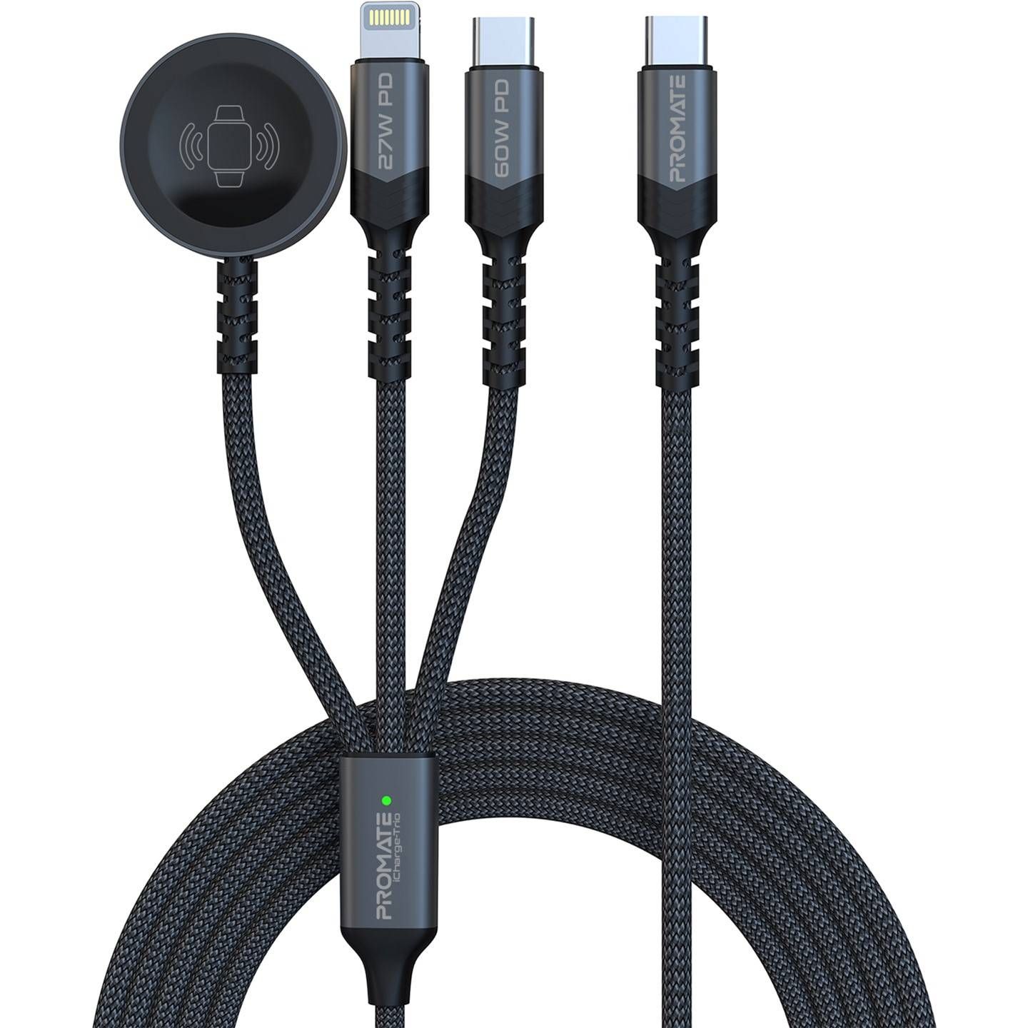 Promate iCharge-Trio - багатофункціональний зарядний кабель. USB-C з підтримкою Power Delivery, 27 Вт Lightning конектор, та бездротова зарядка для Apple Watch.