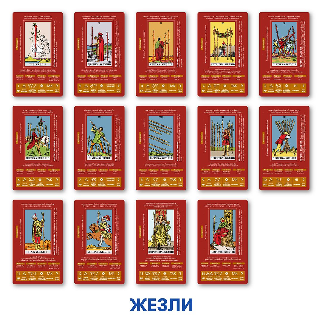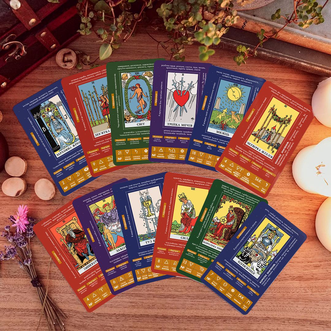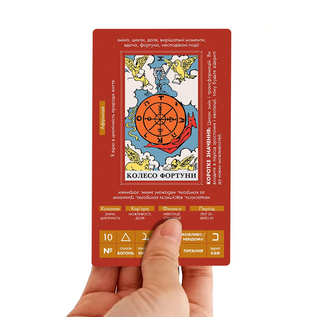 На картах також вказані афірмації, пряме та перевернуте значення карти та її значення у різних сферах життя