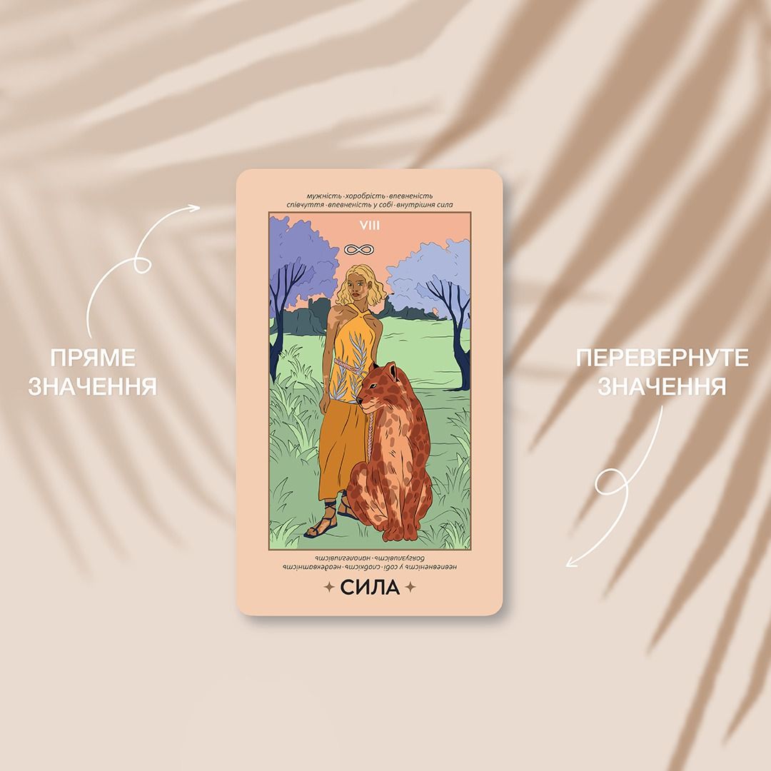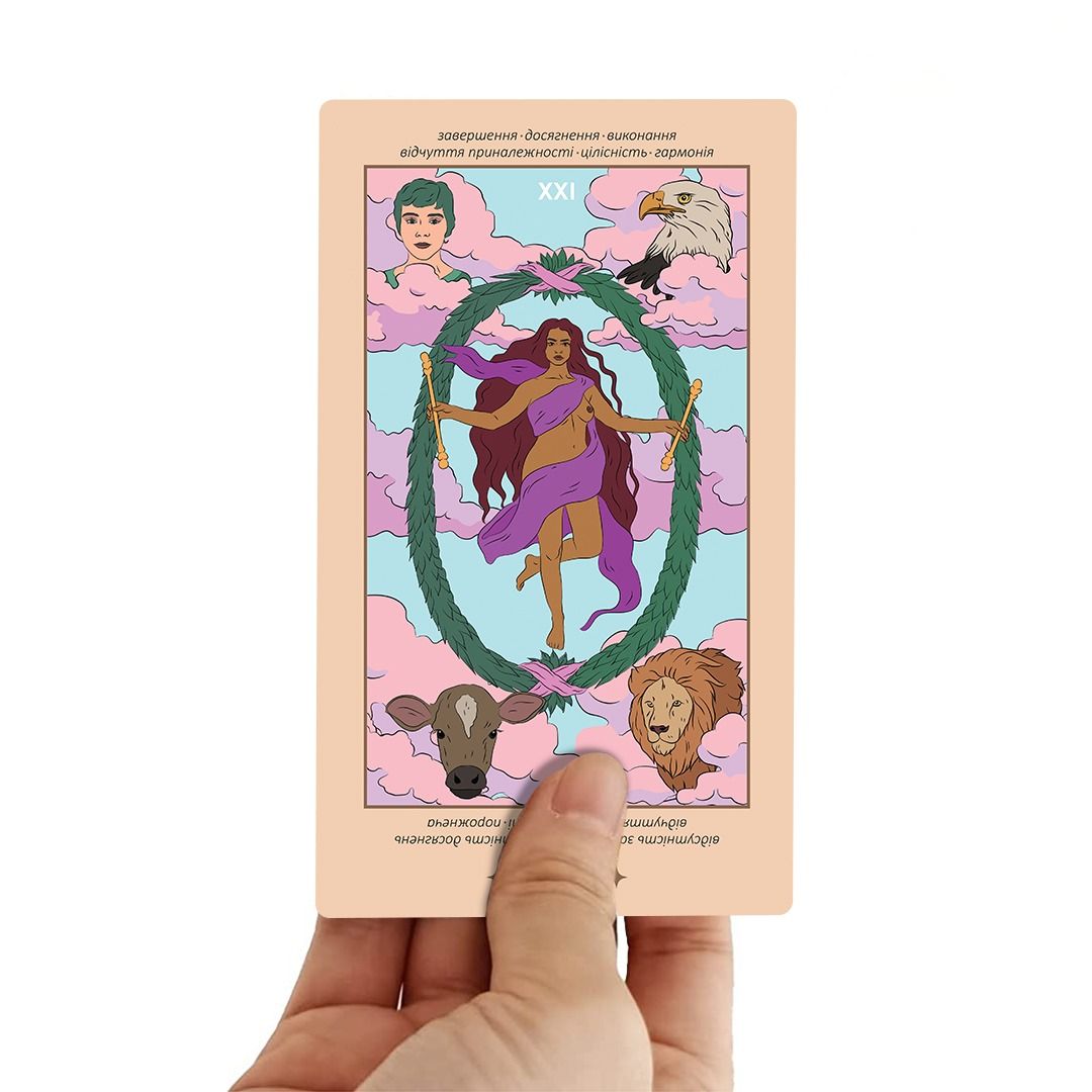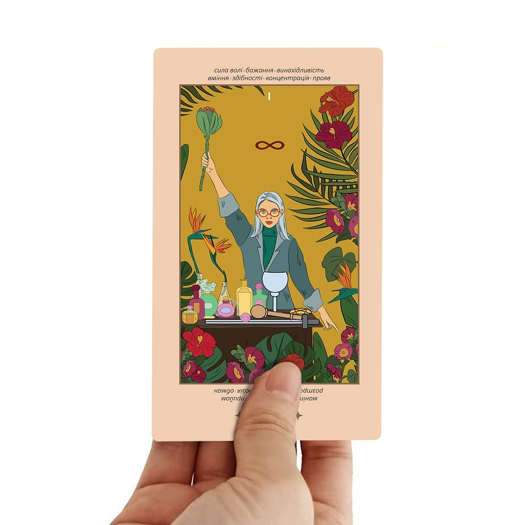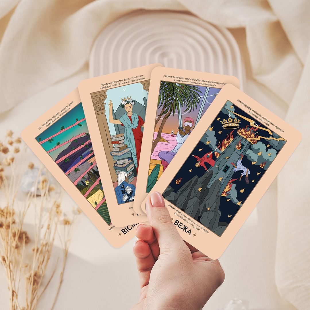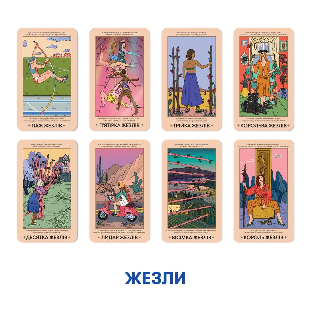 У цій колоді таро зібрані всі незалежні прояви жінок: від форм тіла до ремесла занять, від улюбленого хобі до домашніх справ, від малого до дорослого віку.