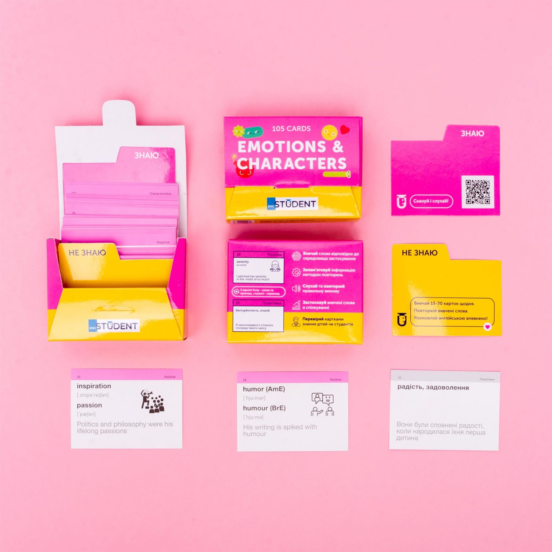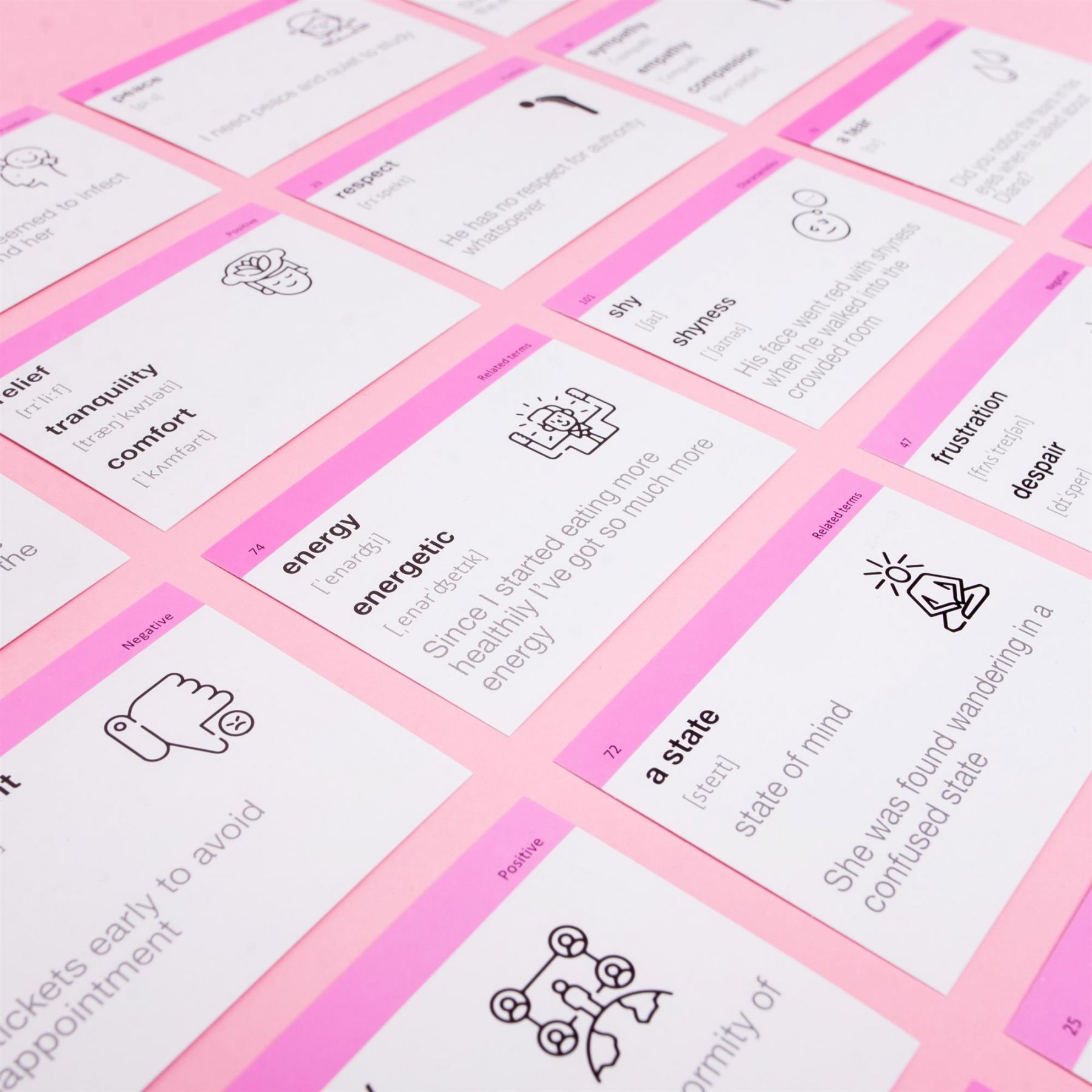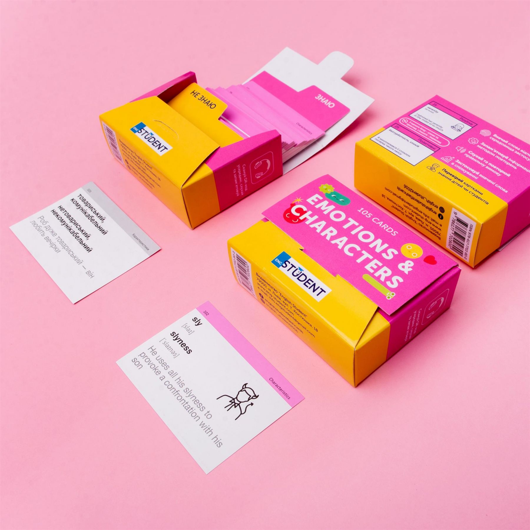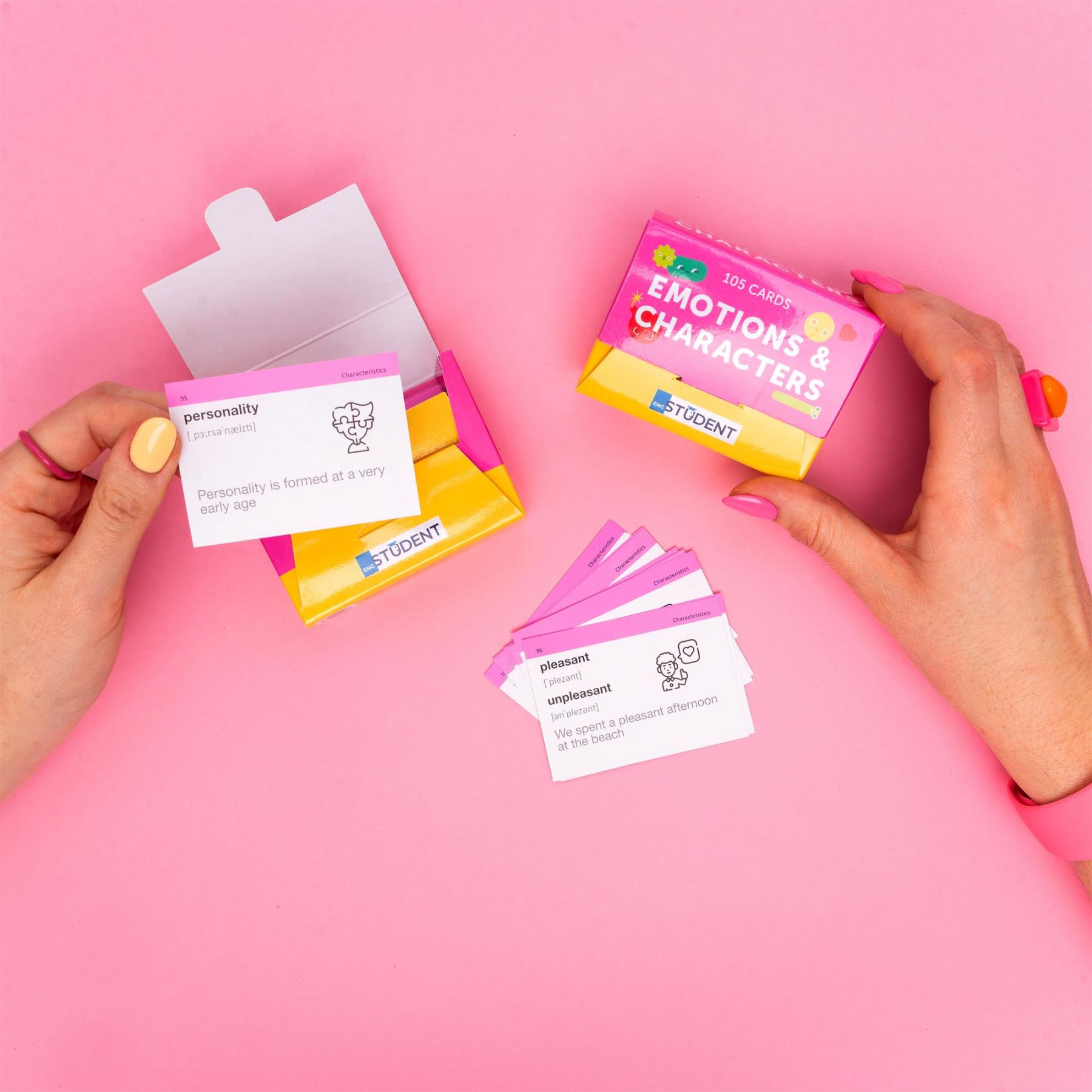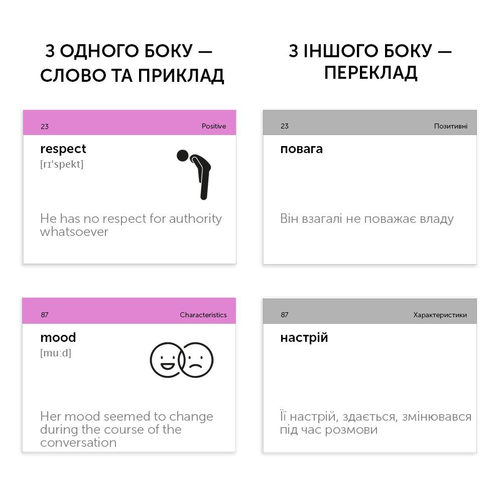 Набір «Emotions & Characters» — набір з дууууже емоційною лексикою. На картках ми зібрали слова, що описують емоції, стани та характеристики. Ідеально підійде психологам та людям, які цікавляться ментальним здоров’ям.
