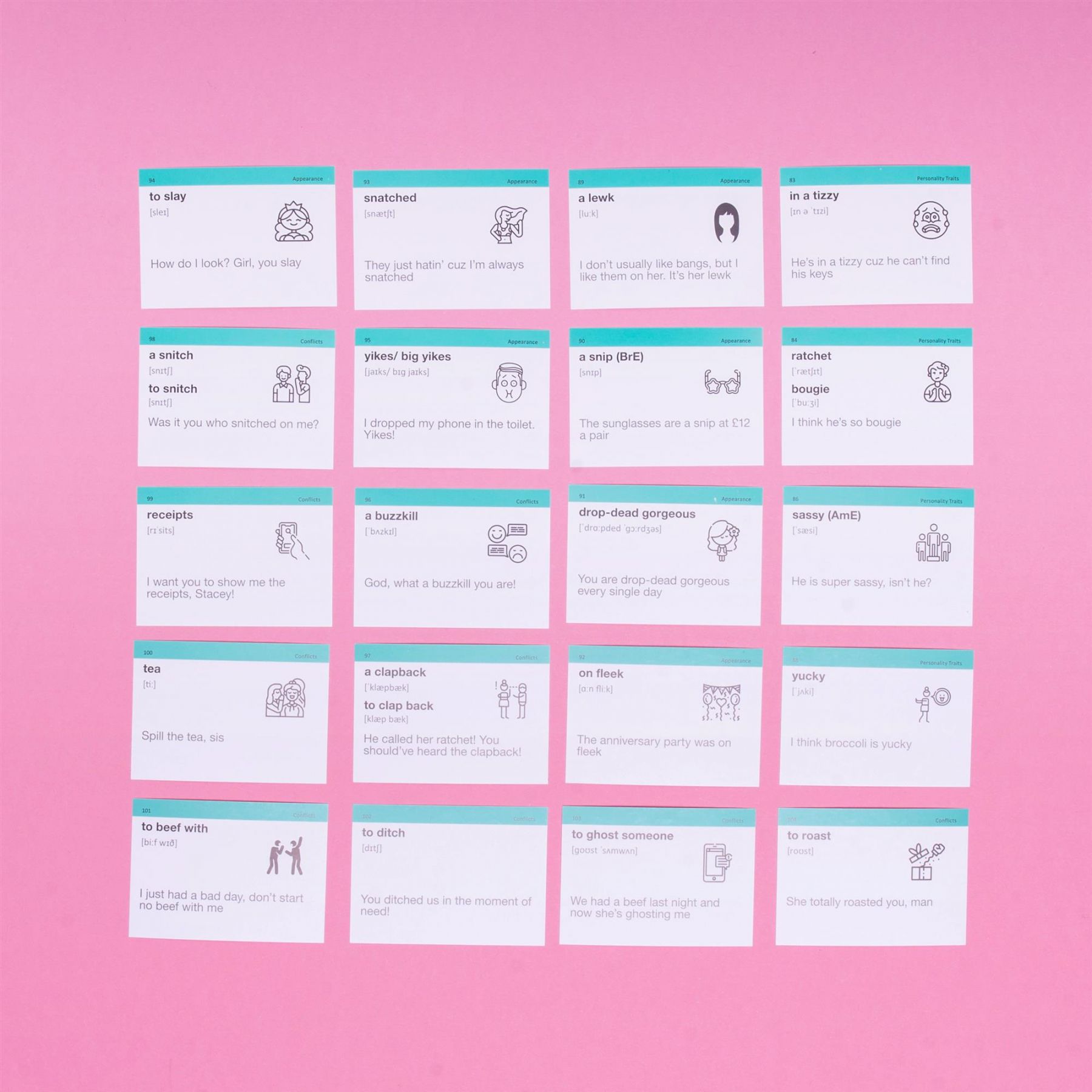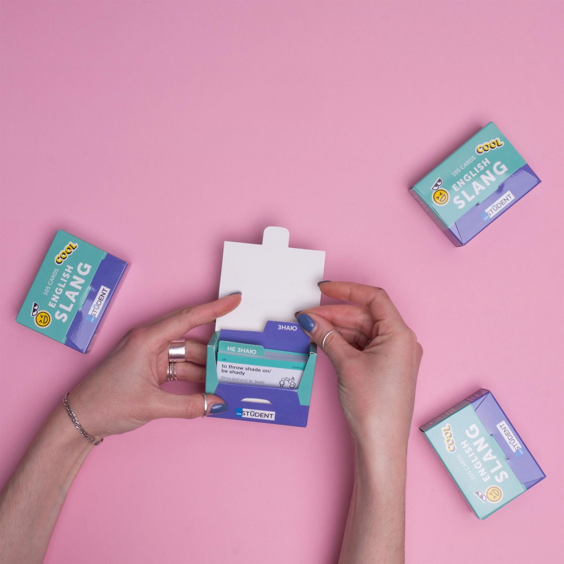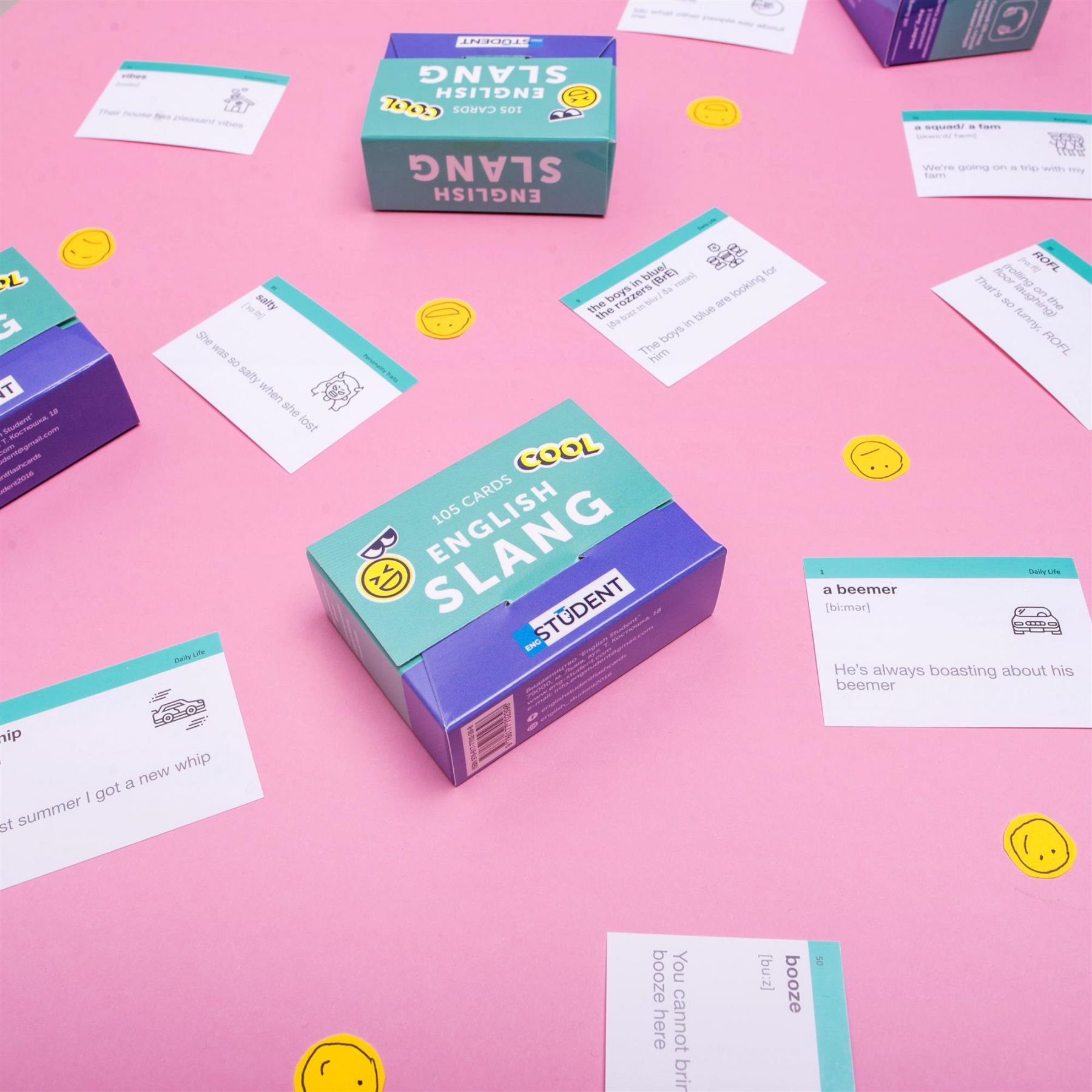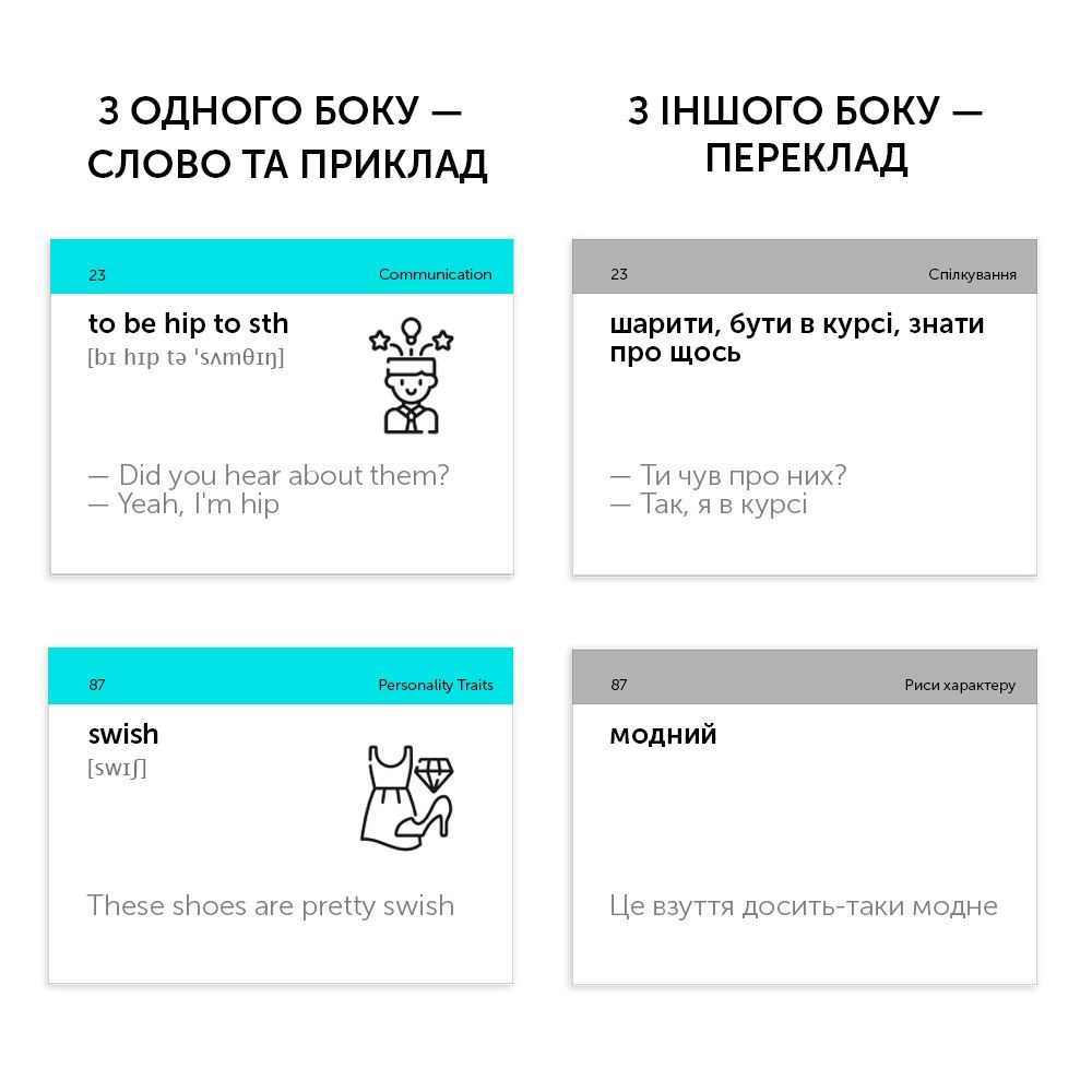 Набір «English Slang» — топова збірка найуживаніших сленгових англійських слів. На картках — популярні скорочення, абревіатури та найактуальніші вирази, які можна зустріти в Instagram, Tik Tok та YouTube. Англійський сленг допоможе розбавити ваше мовлення і зробити його справді живим і натуральним. А правильно вимовляти слова та вирази навчить додатковий звуковий супровід. Набір підійде для тих, хто хоче розуміти скорочення, які використовуються у листуваннях, бути в курсі усіх трендів та знаходити спільну мову з представниками усіх вікових категорій.