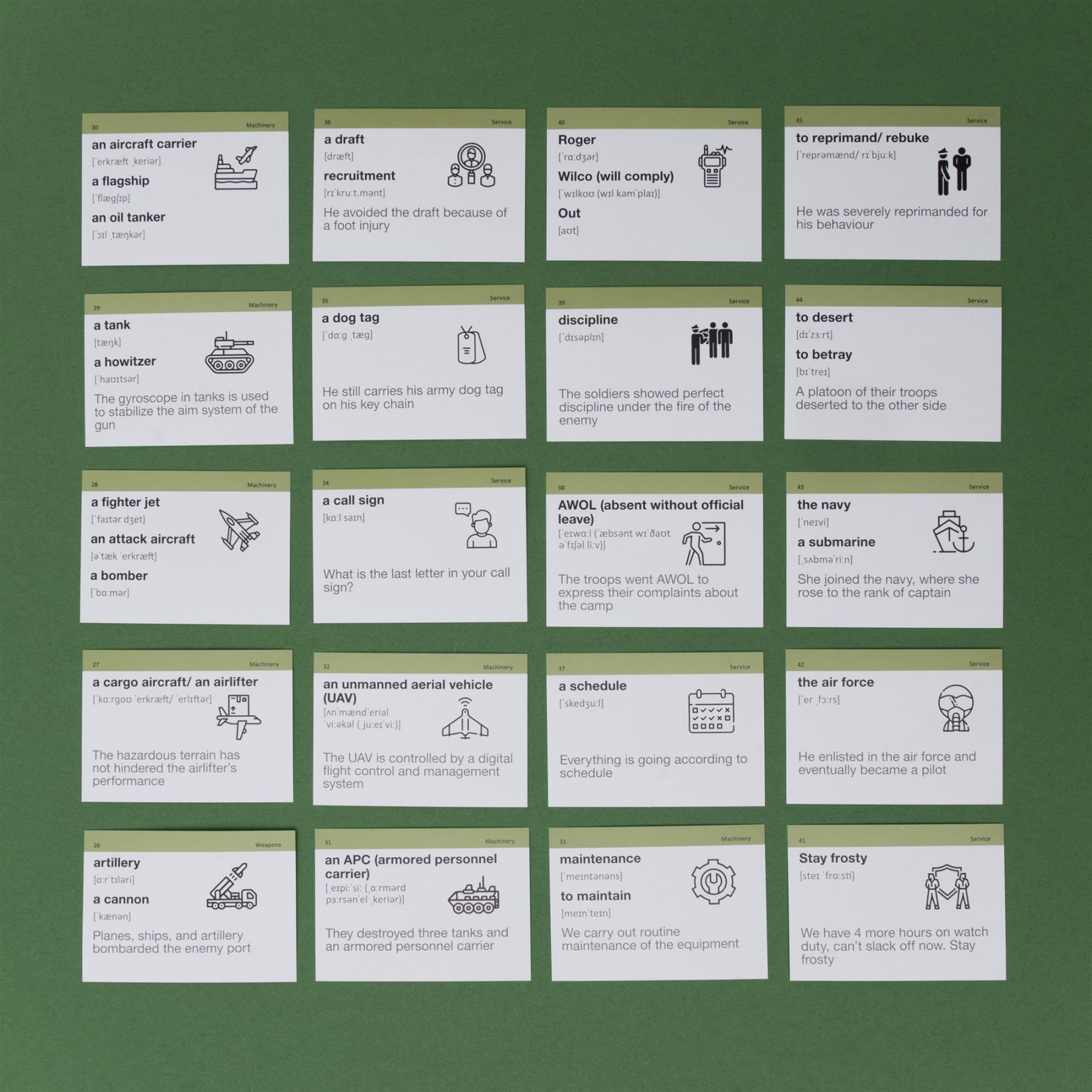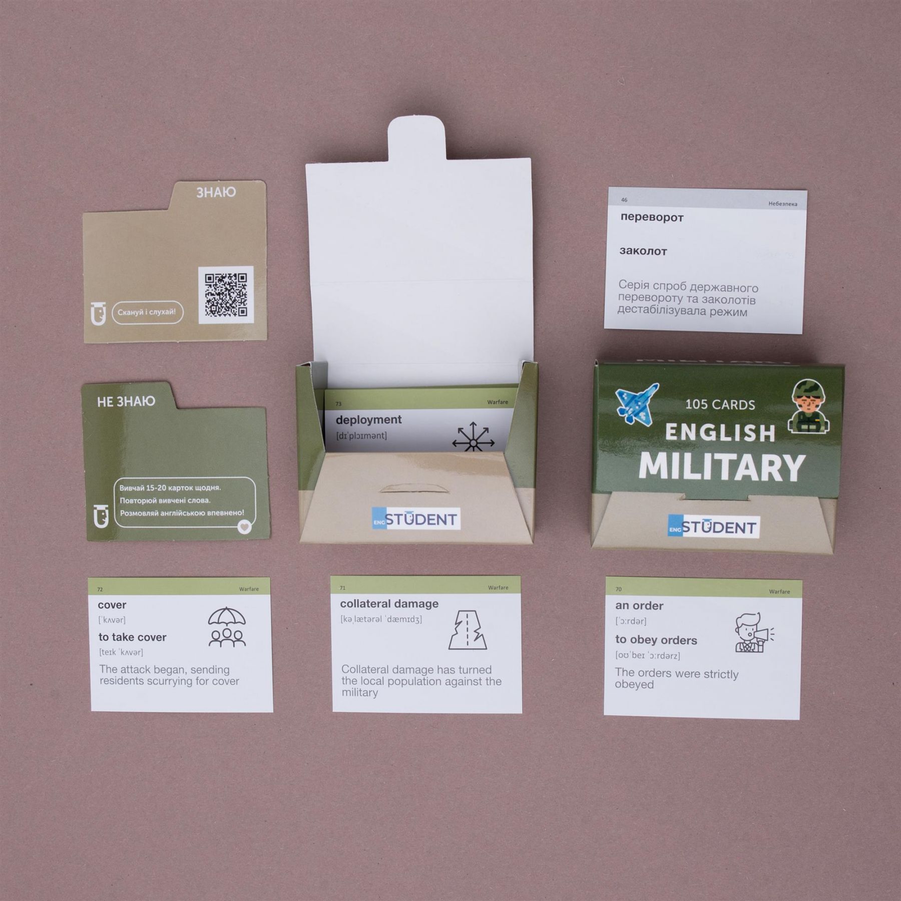 У наборі містяться військові терміни на позначення звань, бойових дій, процесів та характеристик. Також до кожної картки є додатковий аудіосупровід.