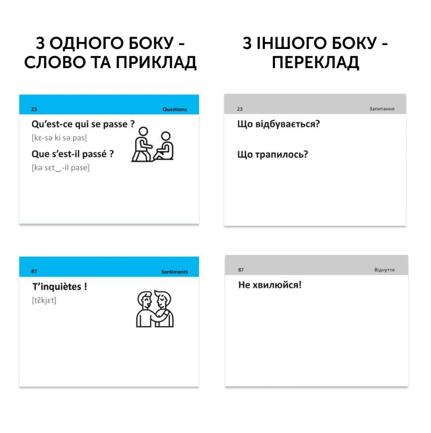 - 105 карток з французькими словами та прикладами їх вживання. На кожній картці є слово та приклад його вживання. А також невелике зображення для асоціативного запам’ятовування. На звороті — переклад;