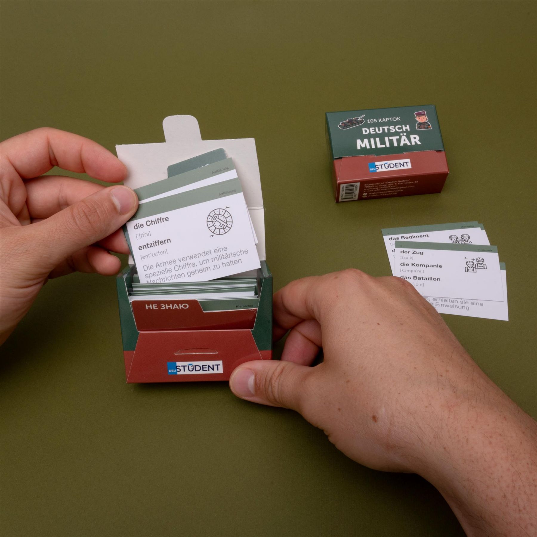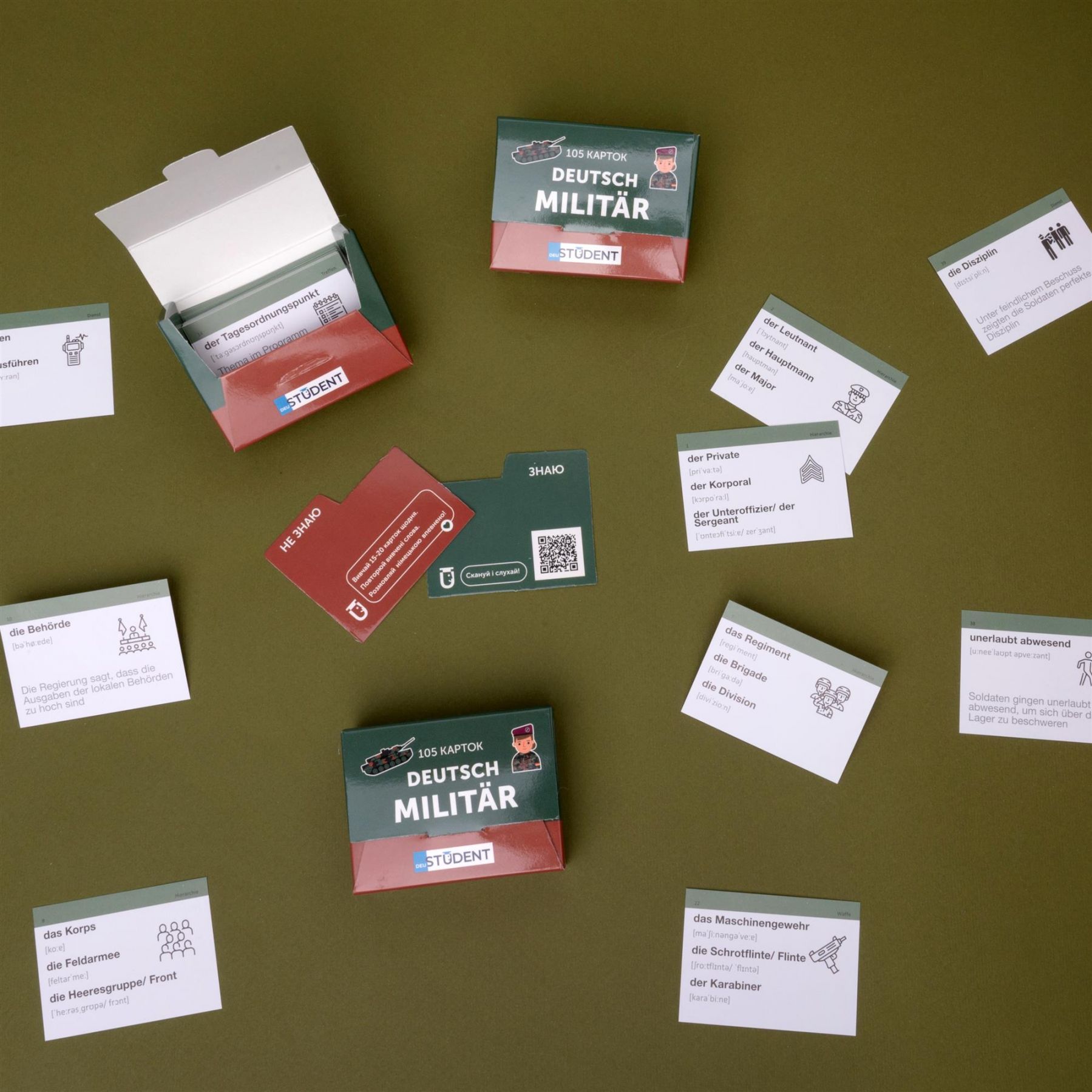 Картки «Militar Deutsch» — це німецька для військових. Набір із військовою лексикою підходить для курсантів, солдатів, офіцерів та всіх інших, які так чи інакше дотичні до армійської справи.