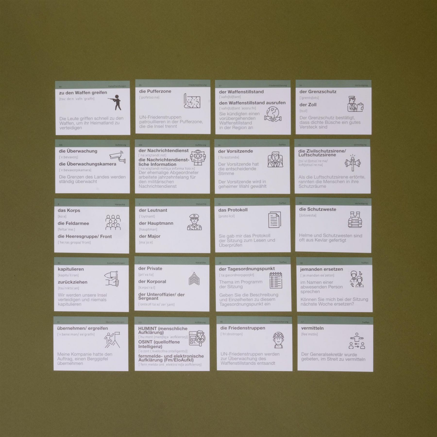 У наборі містяться військові терміни на позначення звань, бойових дій, процесів та характеристик. Також до кожної картки є додатковий аудіосупровід.