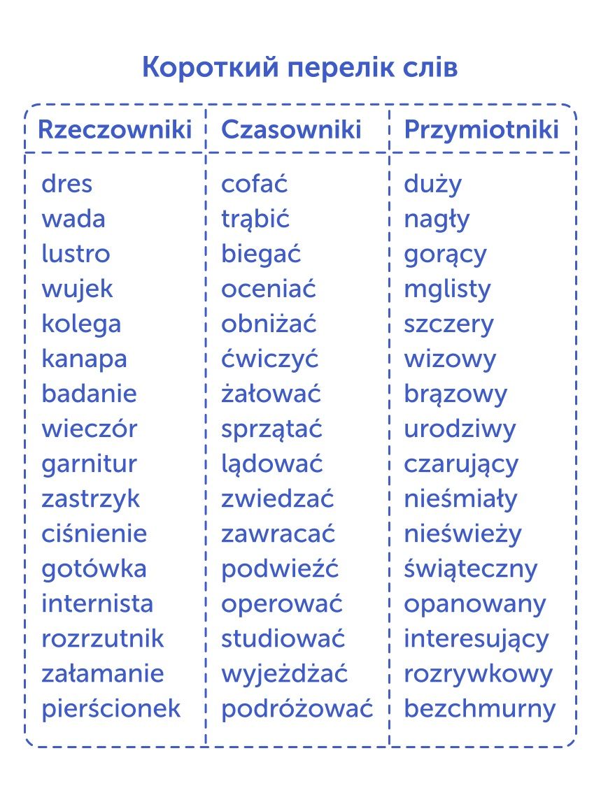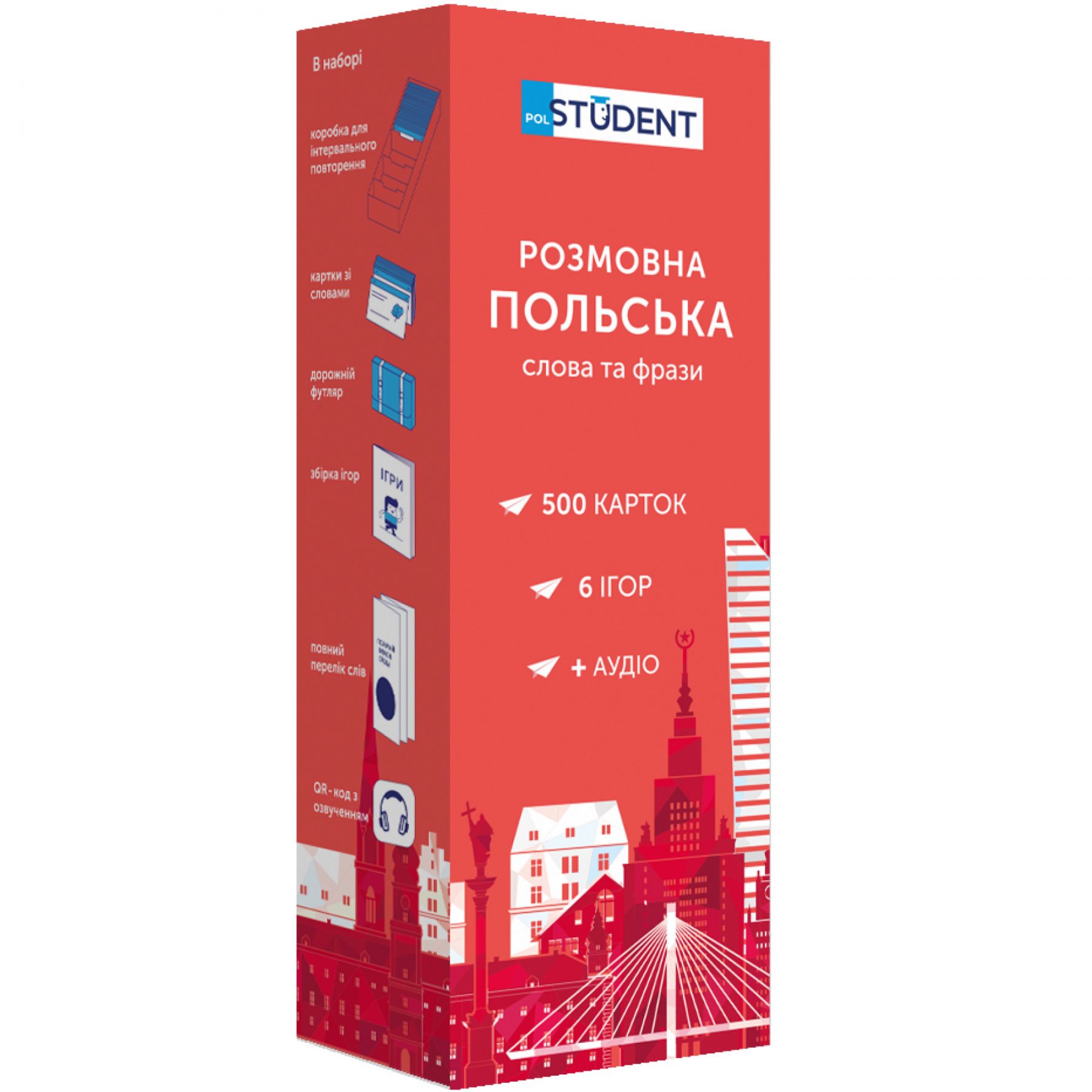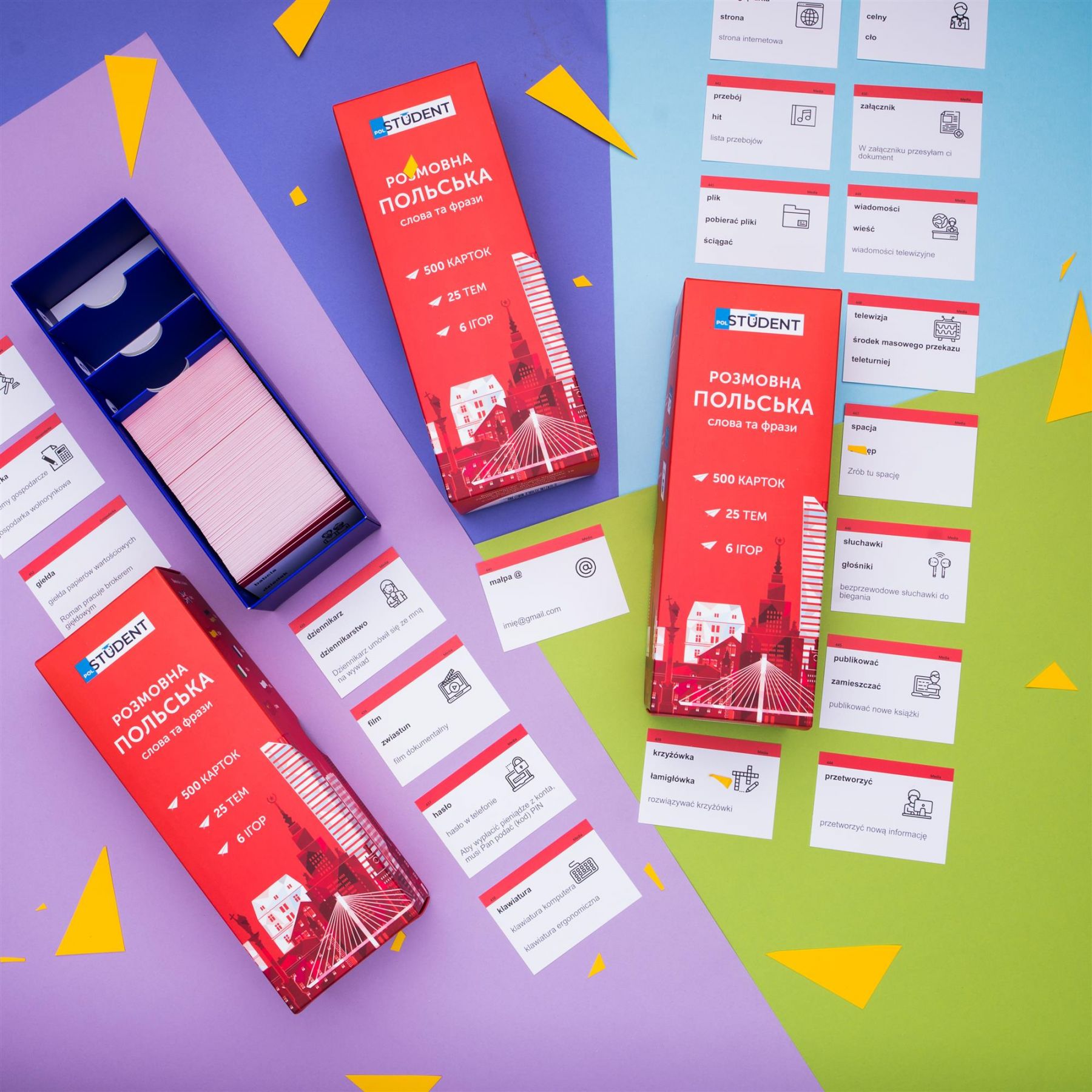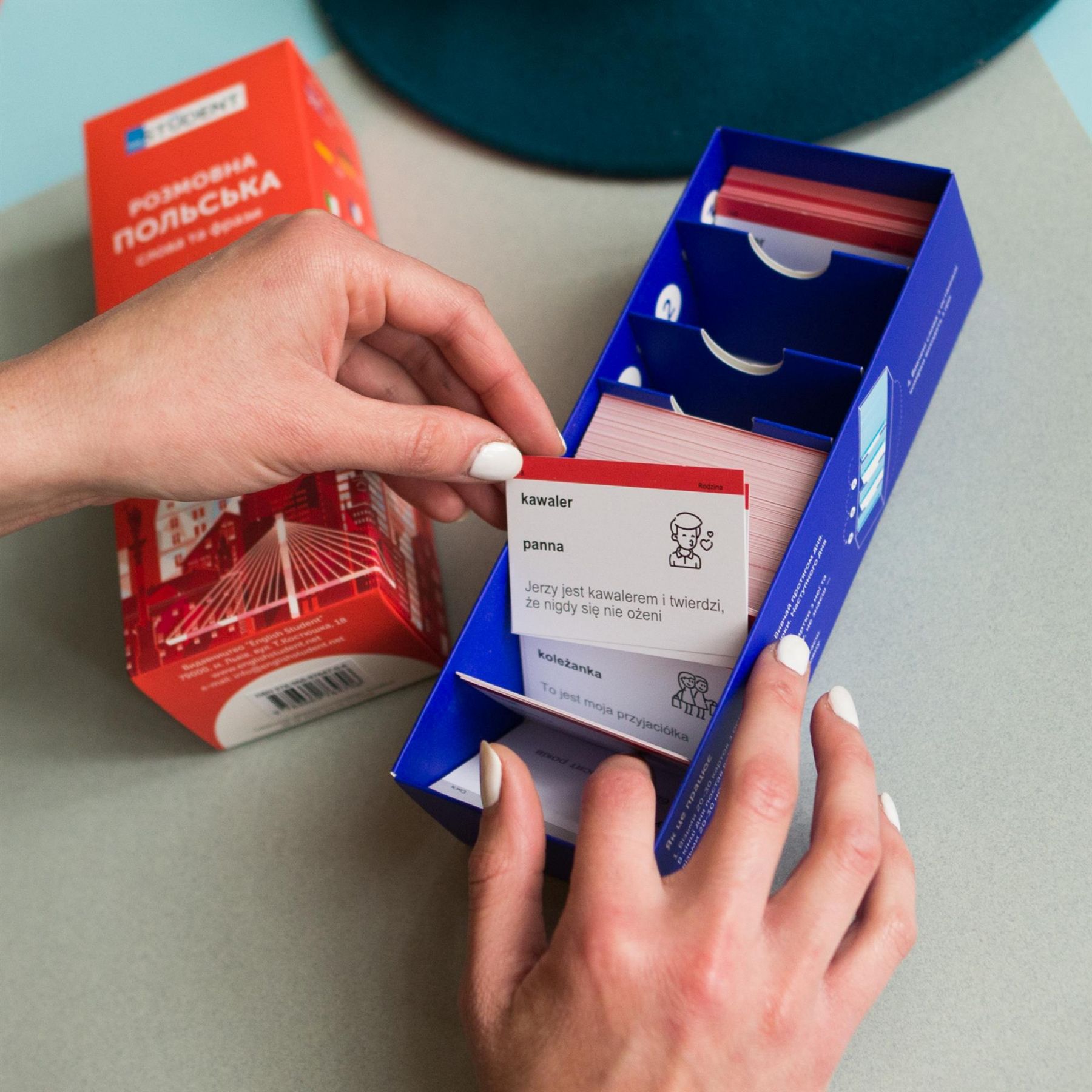 - 500 карток із польськими словами та прикладами їх вживання (600-700 слів). На кожній картці є слово та приклад його вживання. А також невелике зображення для асоціативного запам’ятовування. На звороті - переклад;