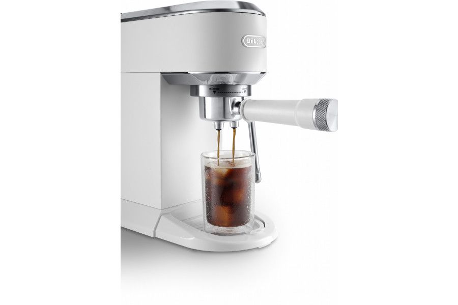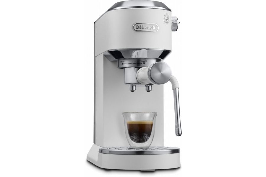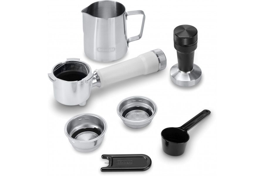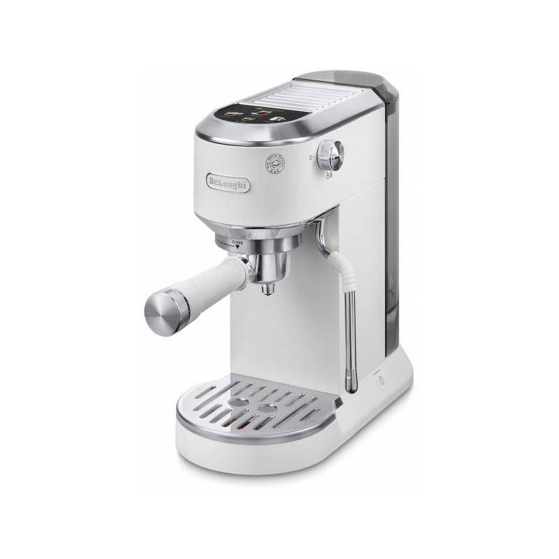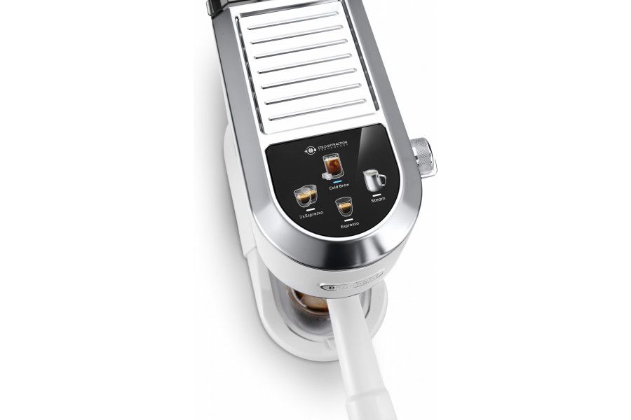 Рожкова кавоварка з потужністю 1450 Вт і сенсорним керуванням. Оснащена дисплеєм, працює з меленою кавою та чалдами. Система приготування капучино з панарело, тиск помпи 15 Бар. Можливість одночасного приготування двох чашок, три крема-фільтри, індикація готовності до роботи, протикраплинна система. Резервуар для води об’ємом 1,1 л, лоток для збору крапель. Автоматичне вимкнення, підігрів чашок, система оповіщення про накип, лічильник порцій, функція енергозбереження. Металевий корпус і ріжок, колір білий.
