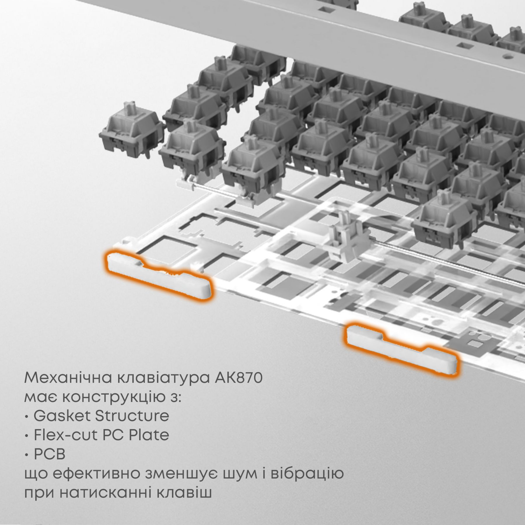Ajazz AK870 Plus - механічна клавіатура від бренду Ajazz є вдалим поєднанням сучасного дизайну, високої надійності та продуманої ергономіки. Підходить як для повсякденної роботи, так і динамічних ігрових сесій.