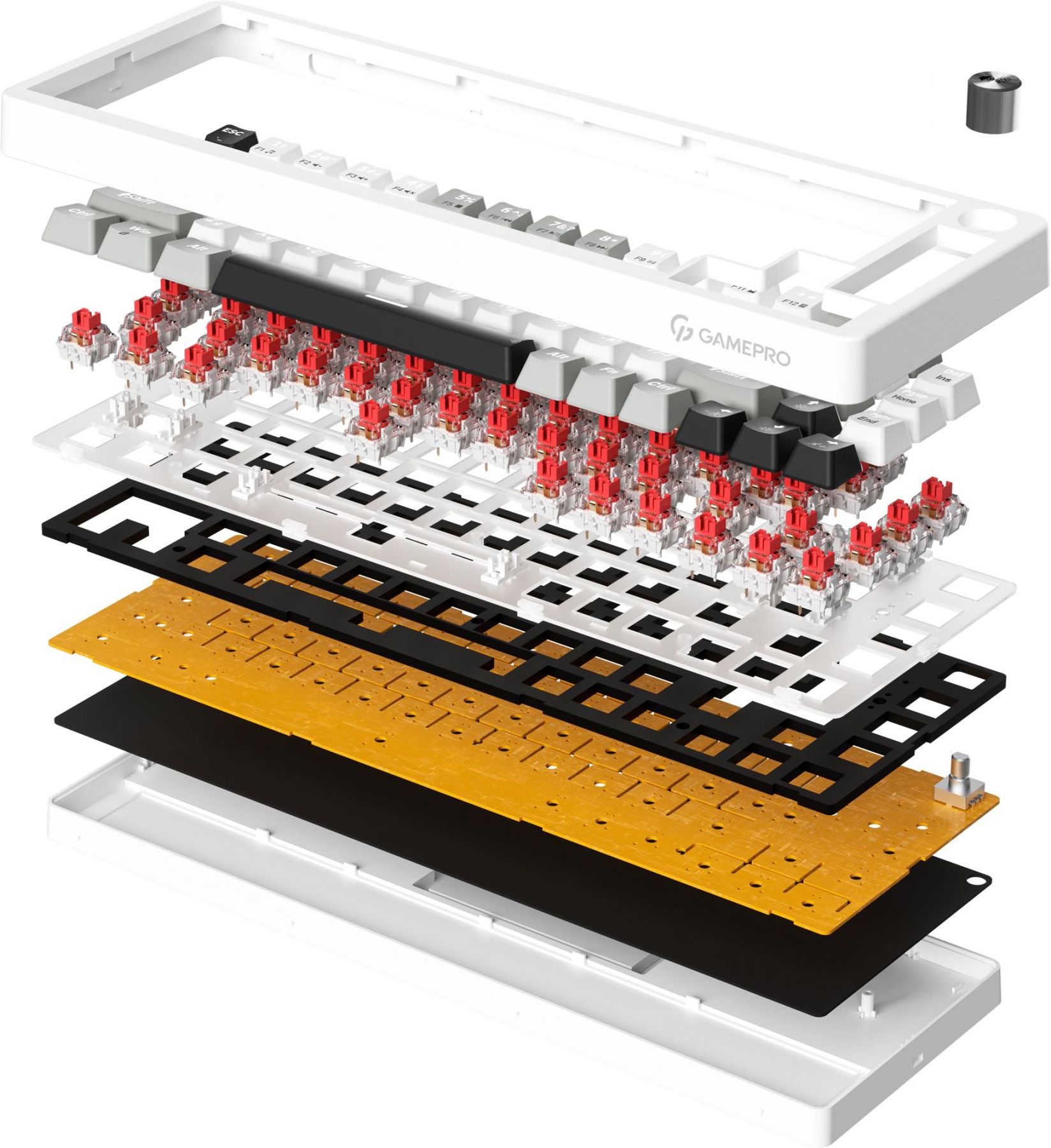 Клавіатура оснащена змащеними лінійними перемикачами Red, що забезпечують плавний хід і мінімальний опір під час натискання. Вони мають ресурс до 70 мільйонів натискань, що гарантує їхню довговічність. Тип побудови Gasket Mount з двома шумопоглинаючими шарами піни EVA знижує шум під час набору тексту та додає комфорту.