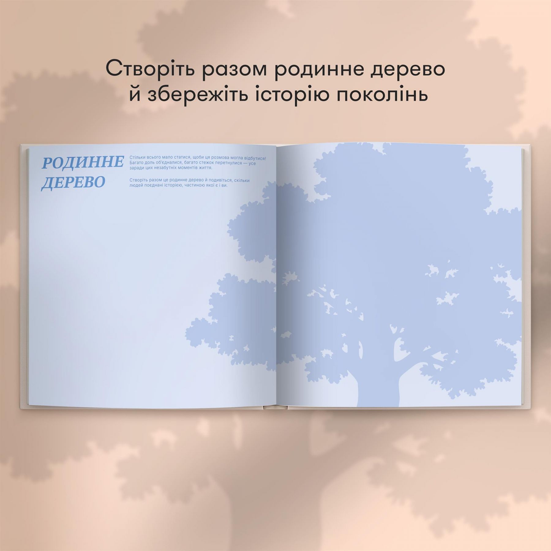 Книга спогадів — запрошення у світ спогадів найдорожчої людини. Вона створена, щоб дбайливо зберегти історії, фотографії, думки й мрії та вибудувати гарну, поступову й неодмінно щиру розмову.