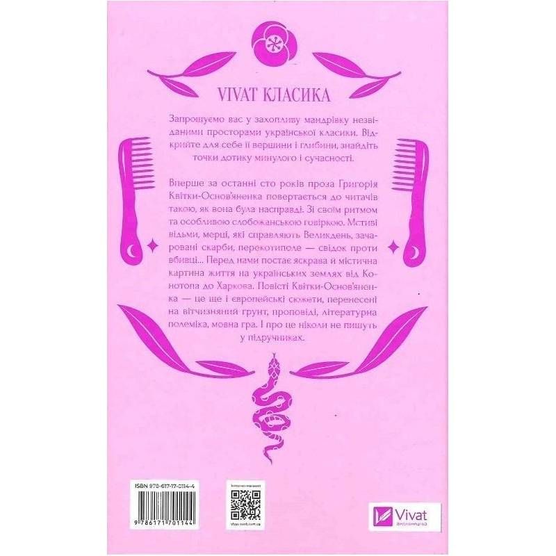 Анотація: Вперше за останні сто років проза Григорія Квітки-Основ’яненка повертається до читачів такою, як вона була насправді. Зі своїм ритмом та особливою слобожанською говіркою. Мстиві відьми, мерці, які справляють Великдень, зачаровані скарби, перекотиполе — свідок проти вбивці… Перед нами постає яскрава й містична картина життя на українських землях від Конотопа до Харкова. Повісті Квітки-Основ’яненка — це ще і європейські сюжети, перенесені на вітчизняний ґрунт, проповіді, літературна полеміка, мовна гра. І про це ніколи не пишуть у підручниках.