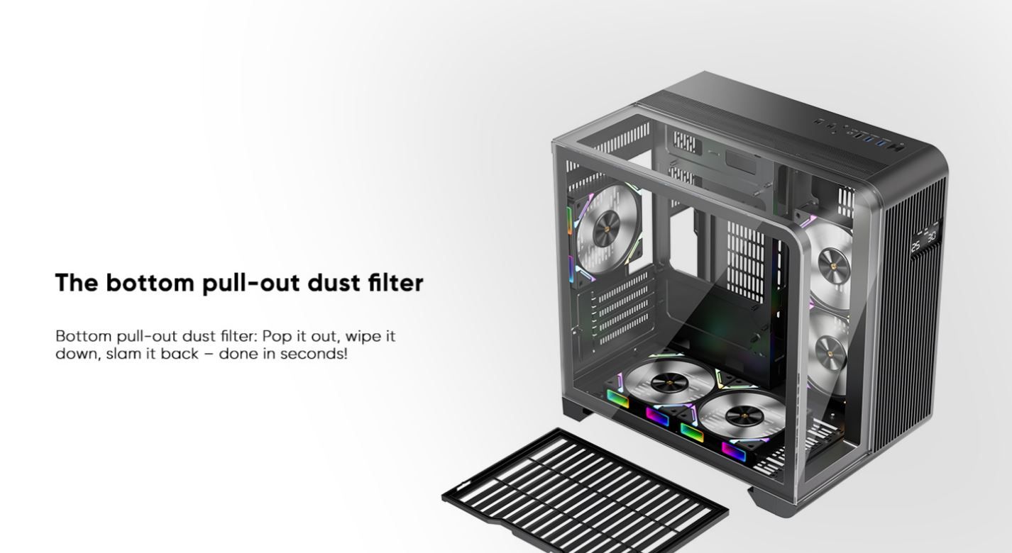 U-подібна конструкція із загартованого скла спереду та зверху, що підкреслює бездоганну естетику вашого складання. Вишуканий зовнішній вигляд у поєднанні з обладнанням та підсвічуванням ARGB забезпечує вражаючий візуальний ефект!