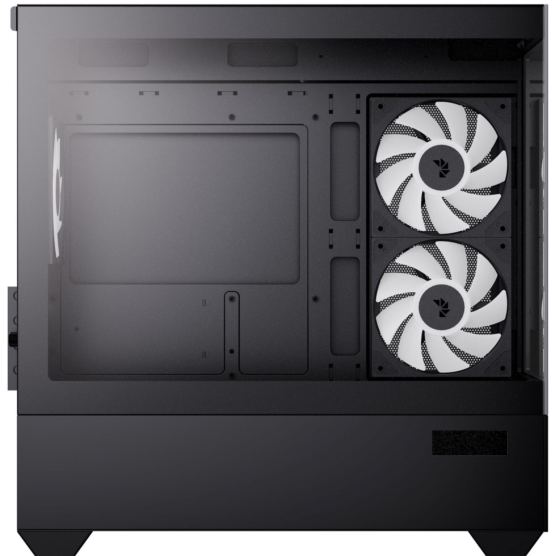 Три вентилятори ARGB 120 мм (два з зворотним розташуванням лопатей) забезпечують яскраве освітлення та повітряний потік, а пилові фільтри і швидкознімна панель спрощують обслуговування.