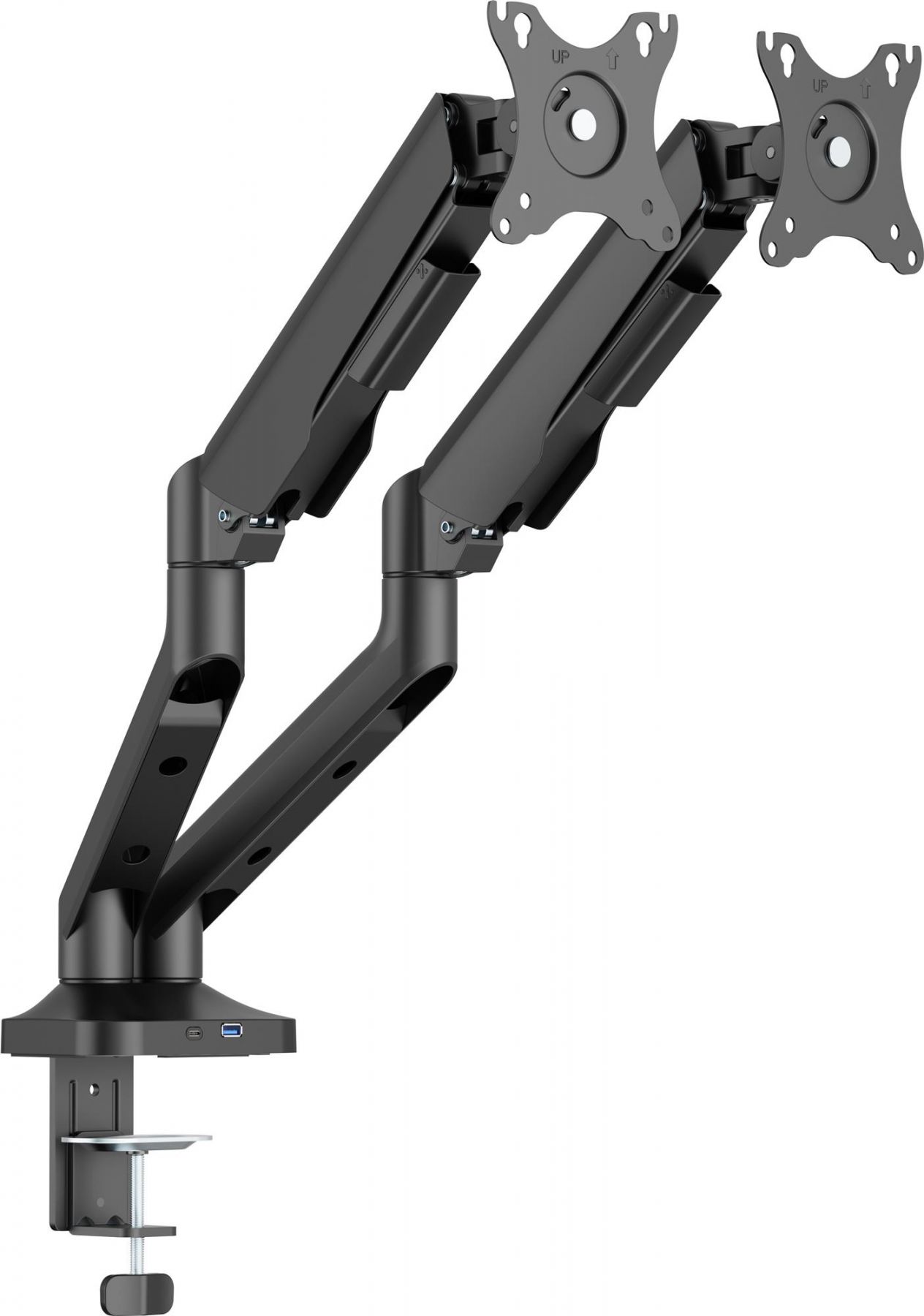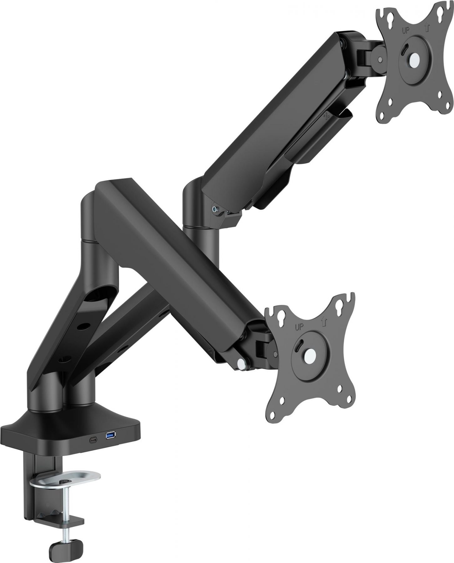 Підтримка стандартів VESA 75x75 та 100x100 забезпечує сумісність з більшістю сучасних моделей. Монтаж можливий за допомогою струбцини або наскрізного отвору для стільниць завтовшки від 10 до 80 мм. Інтегровані порти USB 3.0 та Type-C забезпечують швидкий доступ до підзарядки або підключення периферії, що додає зручності у повсякденній роботі. Вбудована система організації кабелів підтримує порядок на робочій поверхні та покращує загальний вигляд. Це кріплення – ідеальне поєднання ергономіки, функціональності та сучасного дизайну.