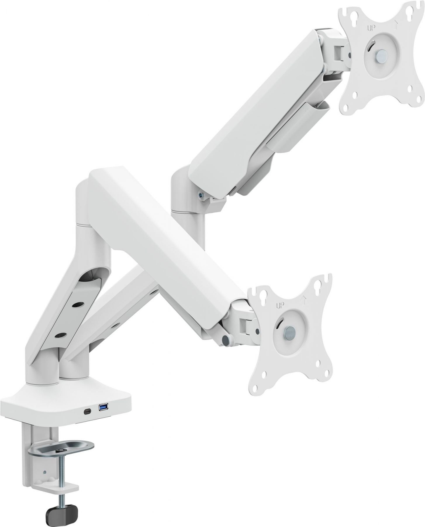 Підтримка стандартів VESA 75x75 та 100x100 забезпечує сумісність з більшістю сучасних моделей. Монтаж можливий за допомогою струбцини або наскрізного отвору для стільниць завтовшки від 10 до 80 мм. Інтегровані порти USB 3.0 та Type-C забезпечують швидкий доступ до підзарядки або підключення периферії, що додає зручності у повсякденній роботі. Вбудована система організації кабелів підтримує порядок на робочій поверхні та покращує загальний вигляд. Це кріплення – ідеальне поєднання ергономіки, функціональності та сучасного дизайну.