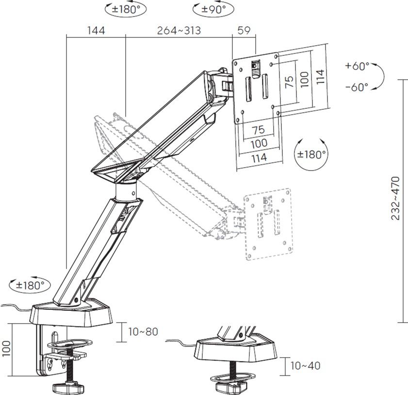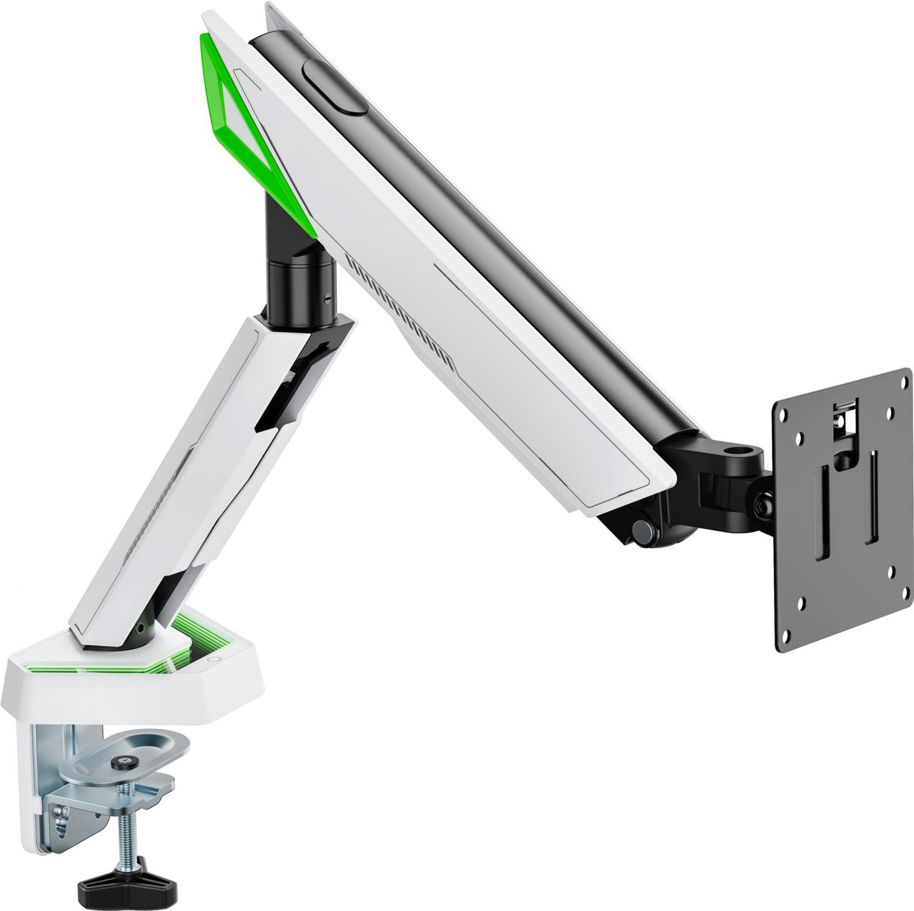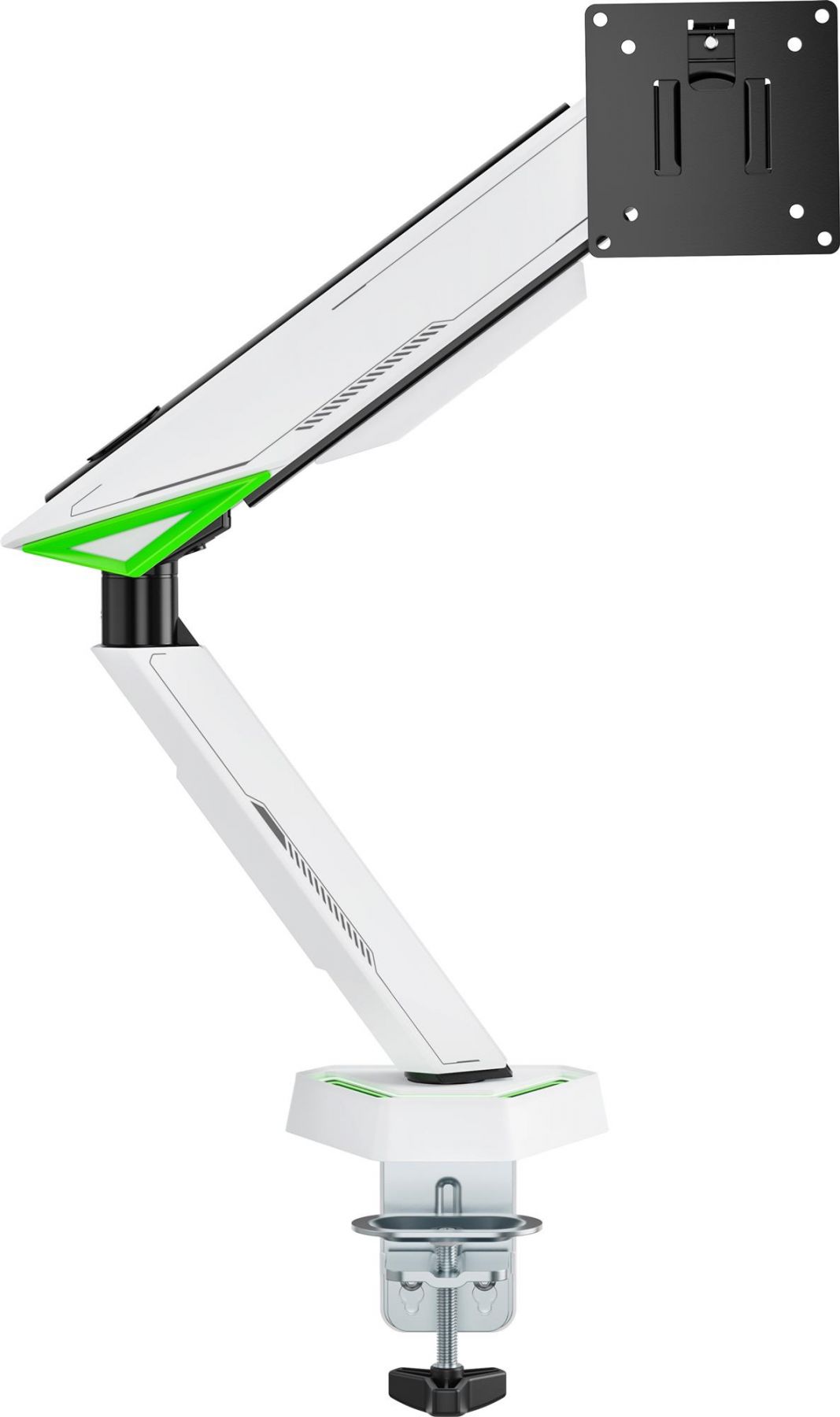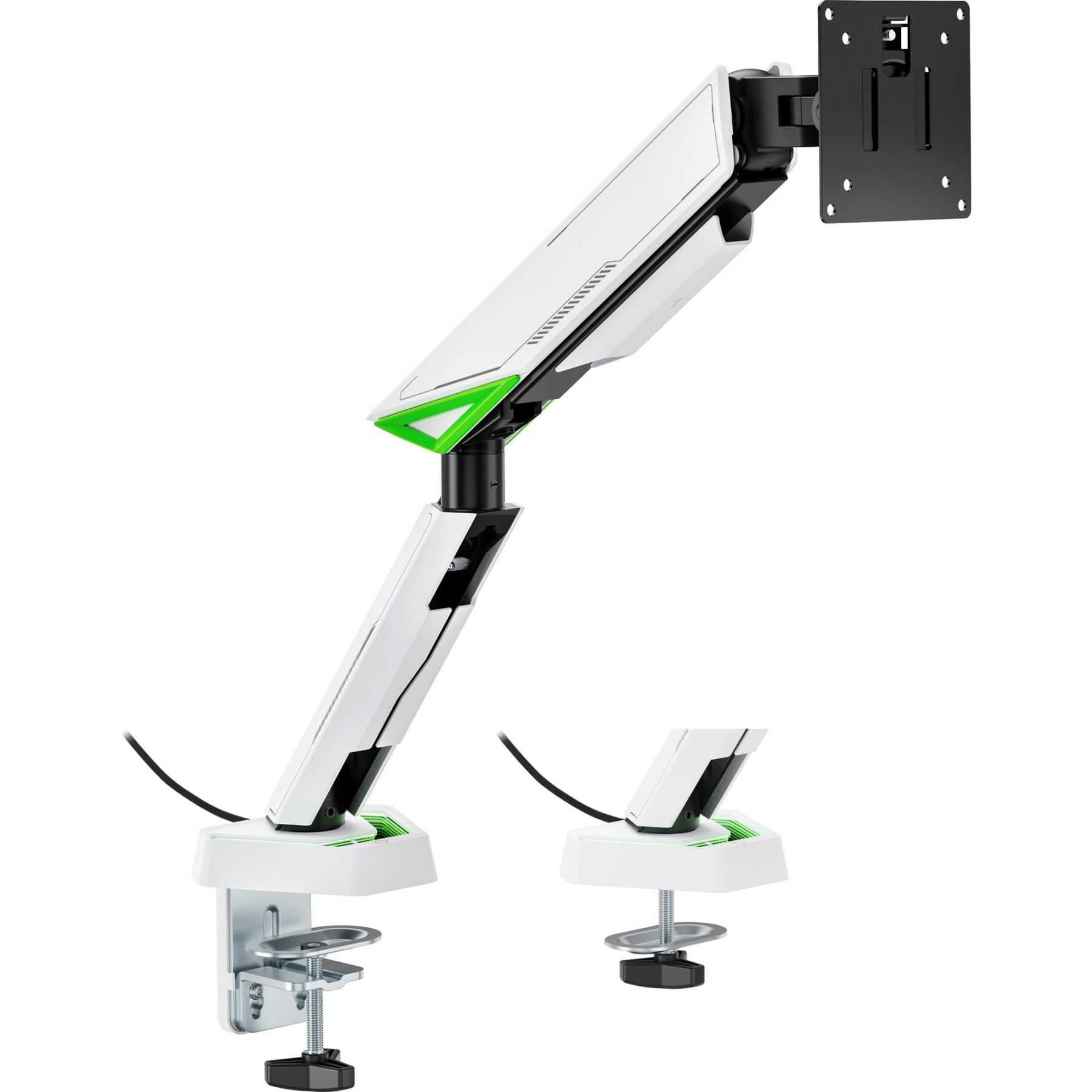 Підтримка стандартів VESA 75х75 та 100х100 забезпечує сумісність з більшістю сучасних моніторів. Кріплення встановлюється за допомогою струбцини або наскрізного отвору на стільницях завтовшки від 10 до 80 мм. Швидкознімна VESA-пластина полегшує монтаж, а вбудована система прихованого прокладання кабелів дозволяє підтримувати порядок на столі. Це ідеальне рішення для тих, хто прагне поєднати функціональність, стиль та візуальний ефект у своїй ігровій чи робочій зоні.