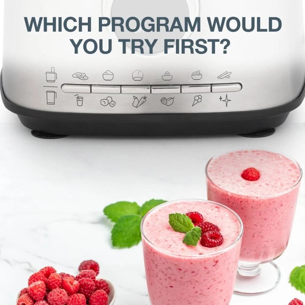 Відчуйте неперевершену зручність з інноваційним дизайном, який керує 12 встановленими програмами за допомогою всього 6 кнопок, дозволяючи вам легко переміщатися між різними функціями приготування та змішування для всіх ваших кулінарних потреб. При обробці продуктів ви можете вибирати між наступними опціями: подрібнення, яєчні білки, тісто, сік, нарізка/шатківниця та картопля фрі/пюре; при змішуванні ви можете перемикатися між наступними опціями: смузі, дроблення льоду, овочі та фрукти, пюре, морозиво та очищення.