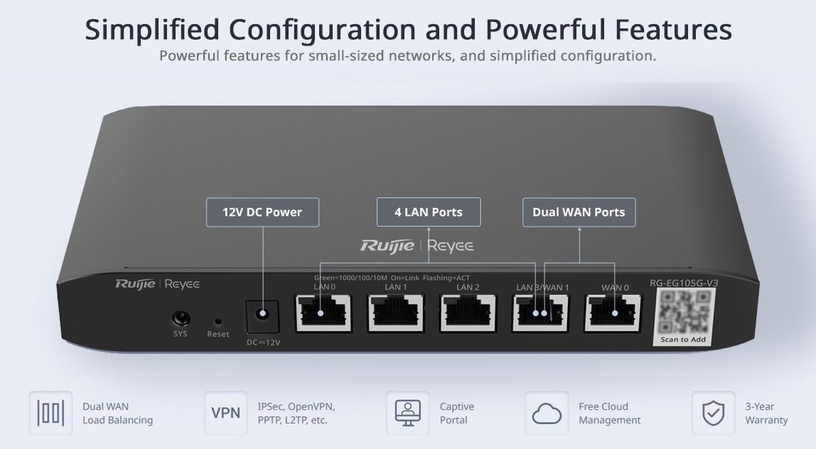 Ruijie Reyee RG-EG105G-P V3 забезпечує багато функціональних можливостей, які значно спрощують його використання. Уніфіковані функції з оновленим флеш-пам'яттю дозволяють користувачам не стикатися з проблемами сумісності. Зручна конфігурація та простота використання роблять цей роутер ідеальним вибором навіть для тих, хто не має глибоких технічних знань. Наприклад, налаштування VPN з підтримкою PPTP, L2TP, IPsec та OpenVPN дозволяє безпечно переглядати Інтернет та взаємодіяти з локальними мережами віддалено.