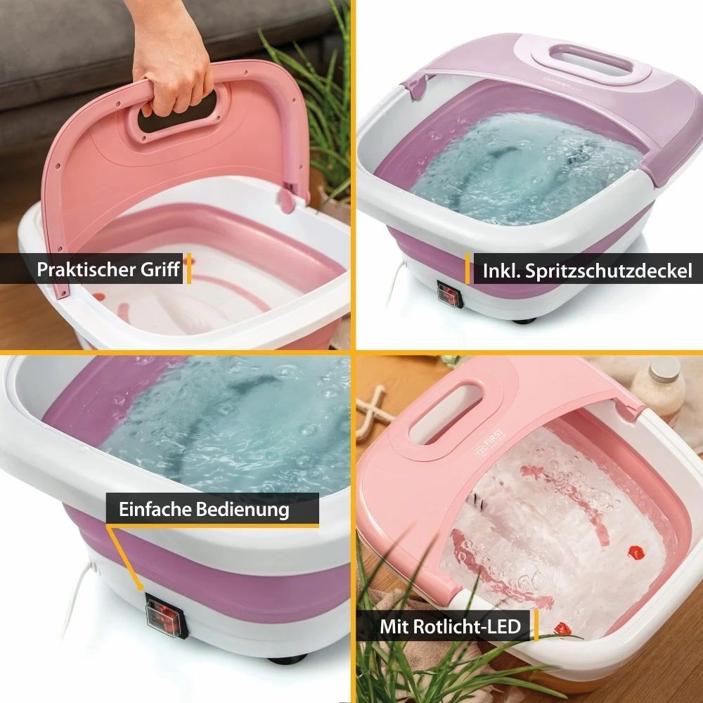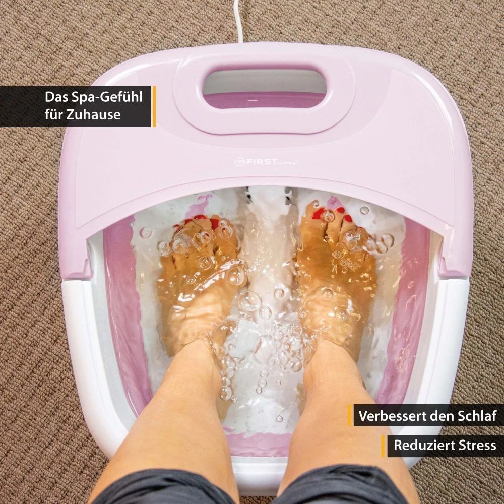 FIRST FA-8116-2: ця ванна пропонує гідромасаж і вібромасаж для розслаблення ніг. Вона також має інфрачервоний прогрів, який допоможе заспокоїти та зняти напругу м’язів. Ванна має 3 програми масажу, які дозволяють вам насолоджуватися різними типами масажу. На вибір доступні дві комбіновані групи функцій: бульбашки/вібрація; тепло/інфрачервоне світло. Масажні виступи на поверхні, регульована вібрація з чудовим бульбашковим масажем, перемикання тепла та інфрачервоне світло гарантують, що ви незабаром відчуєте себе у формі. Важливо відзначити, що на відміну від більшості моделей, цей пристрій легко складається для зручного зберігання. Масажер оснащений зручною ручкою для перенесення і неслизьким дном. Масажер-ванночка First FA-8116-2 — чудовий прилад, який покликаний допомогти вам стежити за станом шкіри стоп. Якісна і безпечна гідромасажна ванна сприятливо впливає на вашу шкіру, сприяє поглинанню вологи і спеціальних косметичних речовин. Масажер допоможе запобігти сухості та загрубінню шкіри, крім цього, він чудово допомагає у стимулюванні кровопостачання всього тіла. Розслабитися допоможуть спеціальні світлові точки. Модель підходить для ніг до 45 розміру взуття.