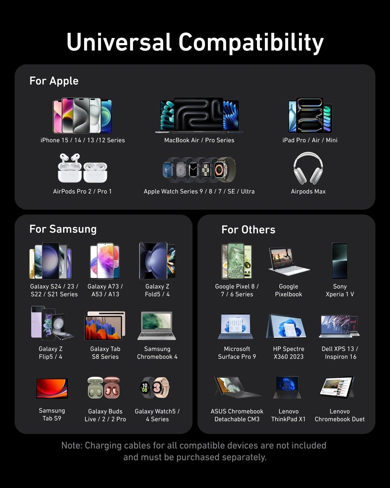 Заряджайте швидко за допомогою зарядного пристрою потужністю 100 Вт, оснащеного двома портами USB-C і одним портом USB-A, що дає змогу одночасно живити кілька пристроїв.