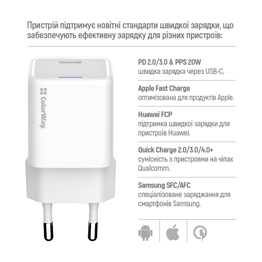 Мережевий зарядний пристрій ColorWay GaN Mini 20W PD Port PPS USB-C White (CW-CHS059PD-WT)