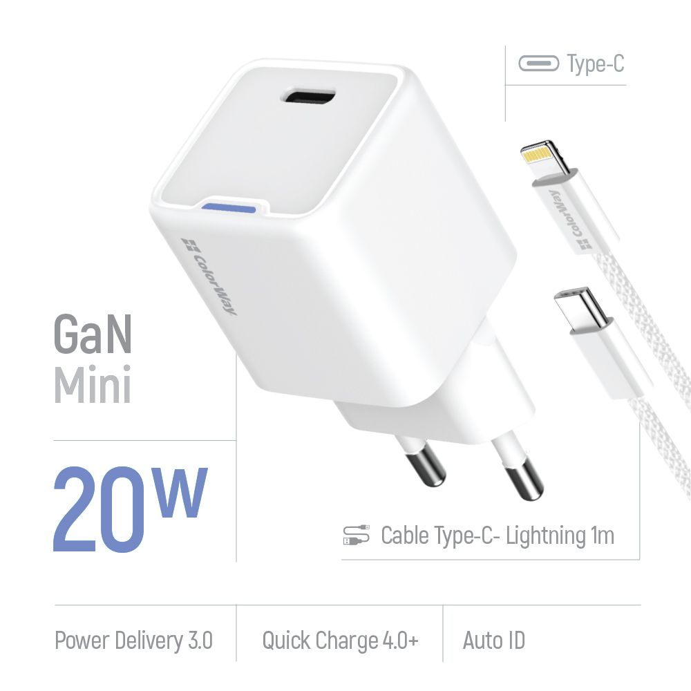 Мережевий зарядний пристрій ColorWay GaN Mini 20W PD Port PPS USB-C White (CW-CHS059PD-WT) + кабель Lightning