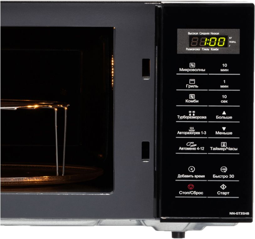Додатково модель PANASONIC NN-GT35HBZPE обладнана дисплеєм, що відображає основні параметри роботи. Завдяки функціям автоматичного приготування та автоматичного розігріву, приготування страв стає ще простішим.