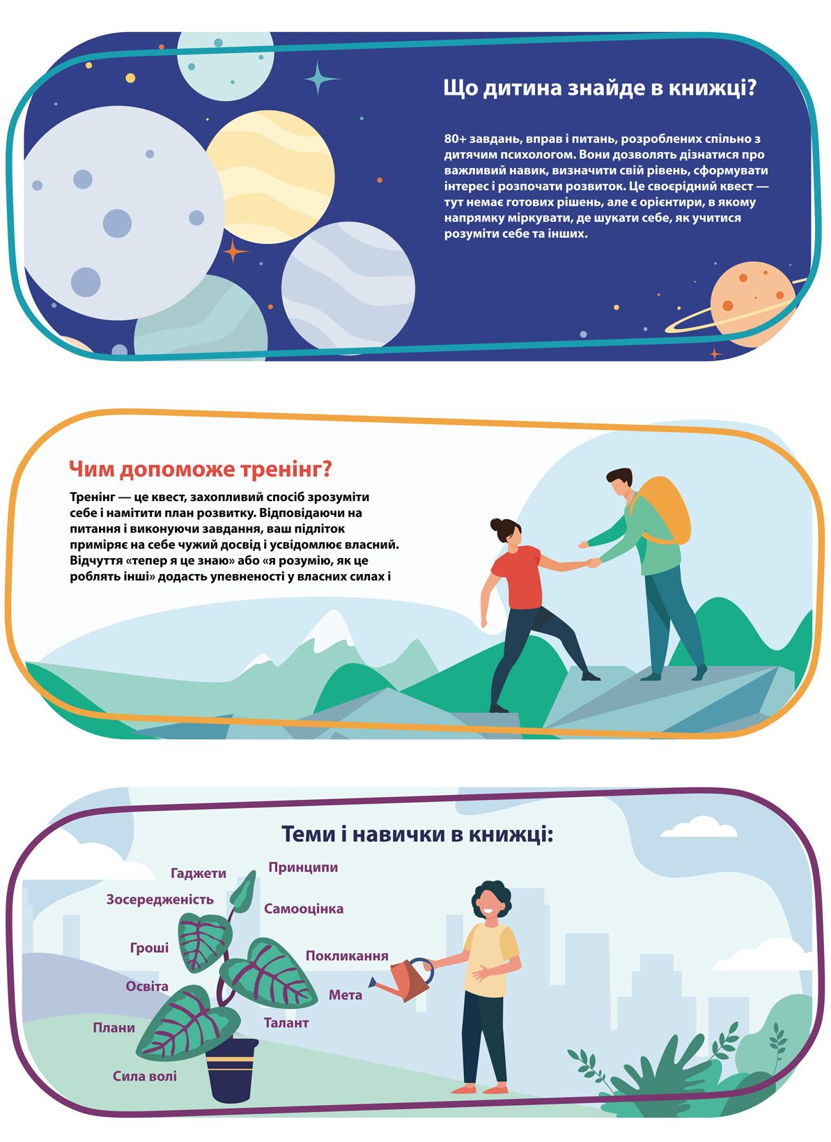 Книжка-тренінг — це своєрідний квест, путівник по самому собі і безкрайньому світу особистого потенціалу.